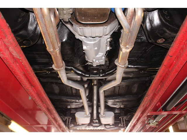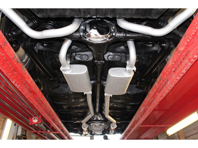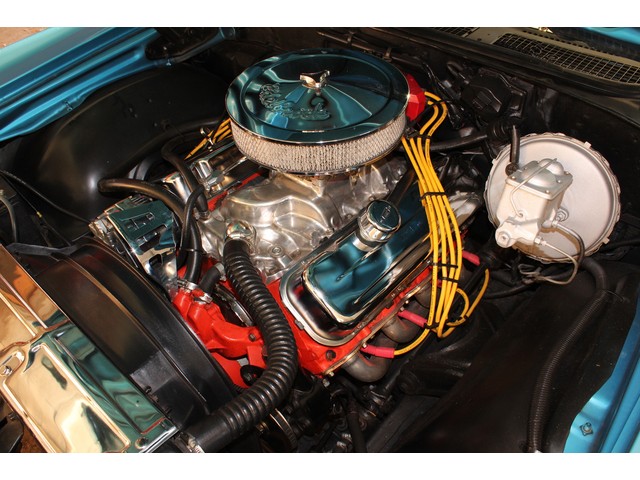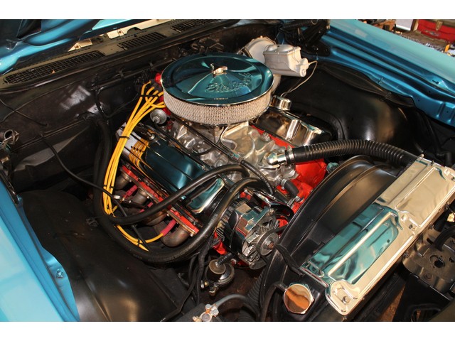 Finally, we will take a look at the heartbeat of the Chevy. Under the hood it has a 402 Bib block that is mated to a 4 Speed trans and 10 Bolt Rear End. The engine has a few upgrades with the aftermarket cam, aluminum intake, Holley carb, and coated headers with Flow Masters. Also it’s been dressed with Chrome Valve covers and breather. This Chevelle has Power Steering and Power Disc Brakes. Under the hood is done nice without being overdone. When you look under this Chevelle the floors all look solid without any patches. All the frame looks solid with visible signs of damage