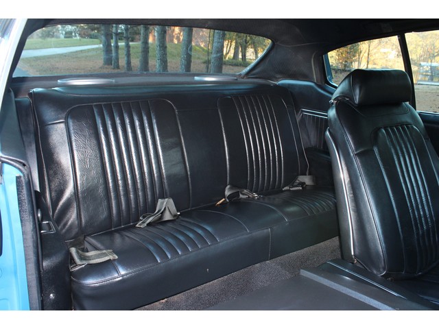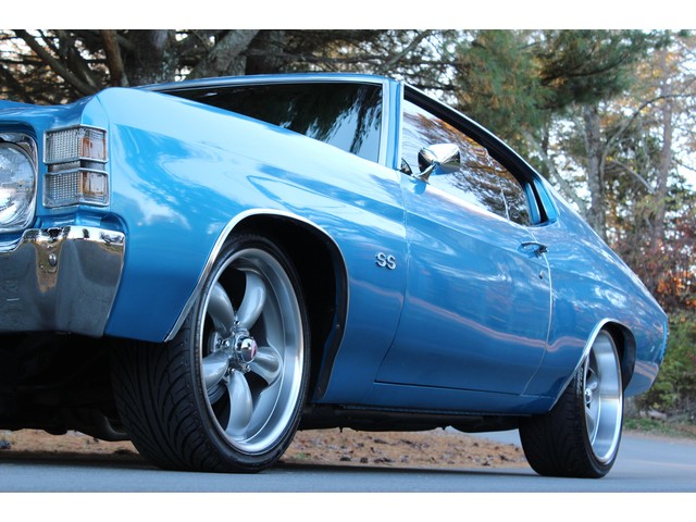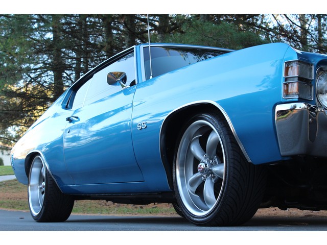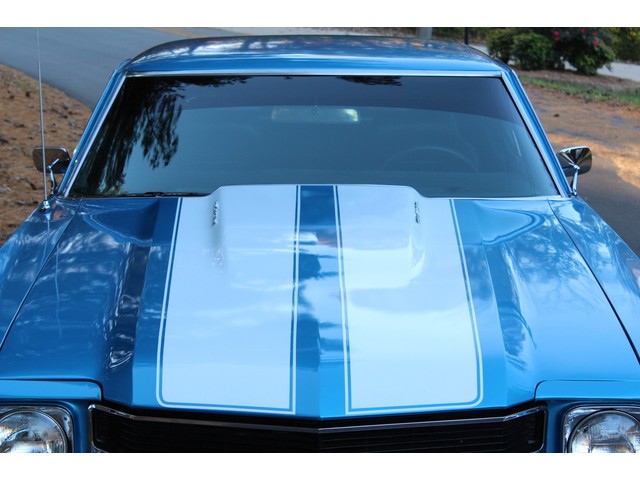 We will start off with the exterior of the Chevelle. When you walk around it you will see solid body with good lines. The fit and finish of the panels is good. Everything is covered in the Ascot Blue paint that is accented by the SS stripes that has all been polished to a deep rich shine and seems to be 2 to 3 years old. The bumpers appear to have been bought new. The stainless as well as the trim chrome looks good. All the glass appears to be in good shape as well as the side glass that works as it should. Also, the Chevelle has been fitted with a 2” steel cowl hood. At the time of the repaint they installed weather stripping and window seals. The final exterior touch is the set of 18” and 20” Coys Wheels with rear being 20x9 and the front being 18x7.