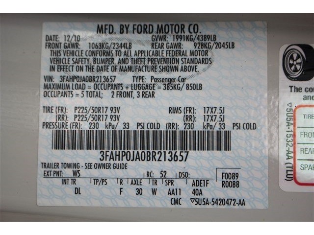 Who could say no to a simply great car like this stunning-looking 2011 Ford Fusion? Want to save some money? Get the NEW look for the used price on this one owner vehicle. Previous owner purchased it brand new and it still looks like the day it rolled off the lot! It is nicely equipped with features such as Fusion SEL, 6-Speed Automatic with Select-Shift, White, Medium Light Stone w/Cloth Front Bucket Seats, 4-Wheel Disc Brakes, 6 Speakers, ABS brakes, Air Conditioning, Alloy wheels, Auto-dimming Rear-View mirror, Automatic temperature control, Brake assist, Bumpers: body-color, CD player, Delay-off headlights, Driver door bin, Driver vanity mirror, Dual front impact airbags, Dual front side impact airbags, Electronic Stability Control, Four wheel independent suspension, Front anti-roll bar, Front Bucket Seats, Front Center Armrest w/Storage, Front dual zone A/C, Front fog lights, Front reading lights, Fully automatic headlights, Garage door transmitter, Heated door mirrors, Heated front seats, Illuminated entry, Leather steering wheel, Leather-Trimmed Bucket Seats w/Heated 1st Row, Low tire pressure warning, MP3 decoder, Occupant sensing airbag, Outside temperature display, Overhead airbag, Overhead console, Panic alarm, Passenger door bin, Passenger vanity mirror, Power door mirrors, Power driver seat, Power passenger seat, Power steering, Power windows, Radio data system, Radio: AM/FM Stereo w/Single-CD/MP3, Rear anti-roll bar, Rear reading lights, Rear seat center armrest, Rear window defroster, Remote keyless entry, Security system, SIRIUS Satellite Radio, Speed control, Speed-sensing steering, Speed-Sensitive Wipers, Split folding rear seat, Steering wheel mounted audio controls, Tachometer, Telescoping steering wheel, Tilt steering wheel, Traction control, Trip computer, and Variably intermittent wipers. Designated by Consumer Guide as a 2011 Midsize Car Best Buy.