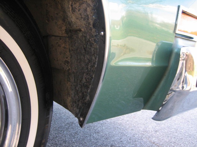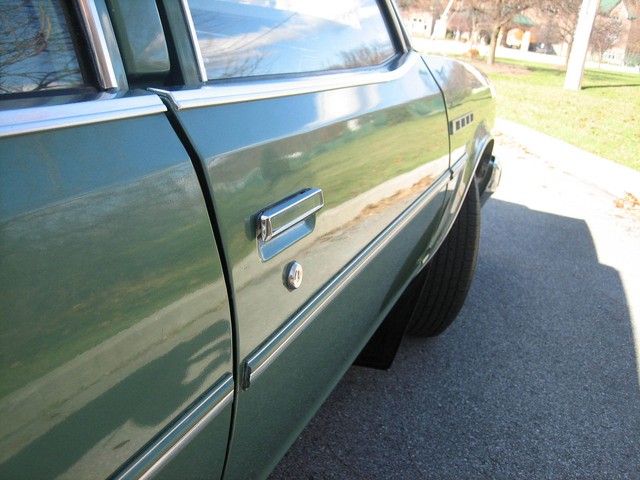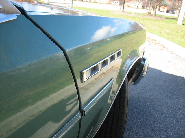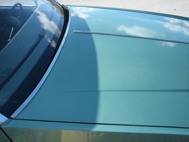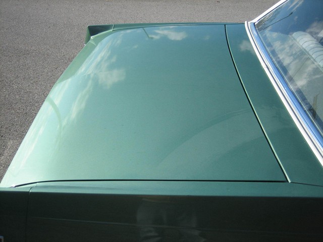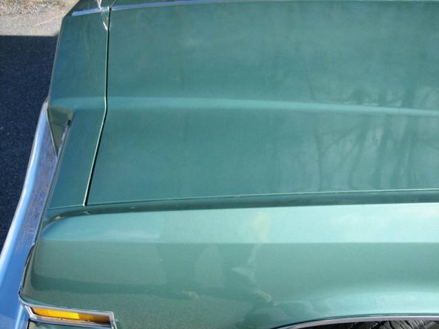 The original paint is a beautiful metallic green with contrasting white vinyl top.  The chrome and the stainless steel also shine very nice.  The vinyl top is in great shape…no rust underneath the vinyl.  The factory chrome wheels are gorgeous and have no road rash or any rust.    The underbody, although not detailed, is also in amazing shape and was never in salt, according to the previous owner’s widow.  The condition confirms this.  There is no rust under the trunk lid or under the doors.  There are no dings or dents to speak of, anywhere.  The car was obviously garage kept all its life.  The paint is nearly immaculate, with few imperfections, as follows:  1)  upon very close inspection, only in certain light, a portion of the paint on the hood is just starting to wear thin.  It is so slight the pictures cannot show this.  2) The corner of the trunk (near the rear window) has a minor discoloration, like maybe a rag with some cleaner was wiped across the corner.  The texture of the surface was not damaged, just discolored some on the corner of the trunk.  Maybe with some good compound it could be corrected.  3) Directly behind the left rear door, there is an older repair of what appears to have been a small dent in the quarter panel….the dent was filled in and there is some alligatoring of the paint in this area.  All 3 of these imperfections are not very noticeable, and must be seen up close in the proper lighting….difficult to see in pics and not readily noticeable in person but I want to be up front so there is full disclosure.  I would say the car is show-worthy as is.  The exterior is overall very nice and is obvious of the care it has received.  Again, the car is in amazing, beautiful shape, and is ready for the show!