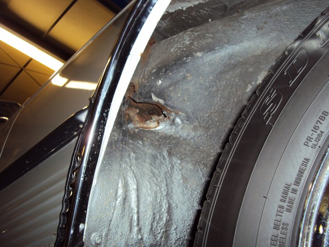 Bubbling rust at the bottom of the right front fender just behind the wheel opening.