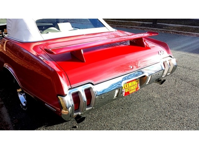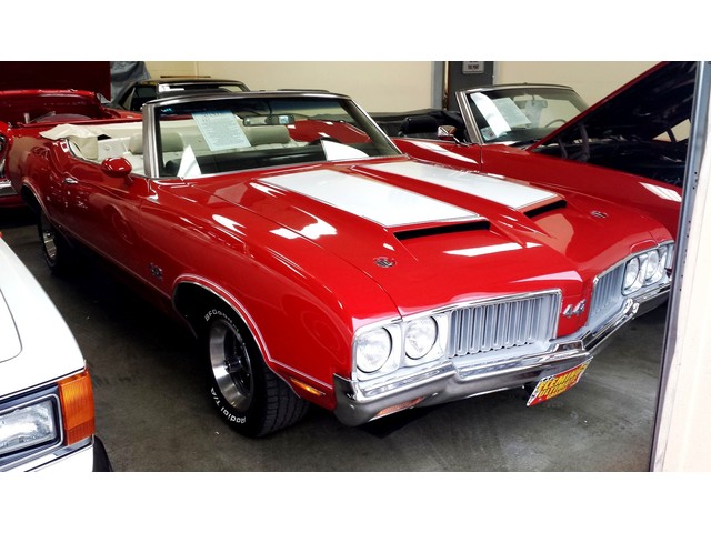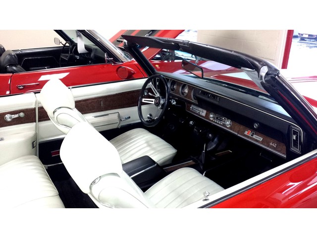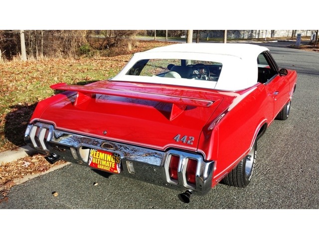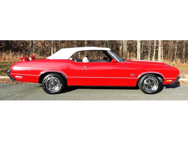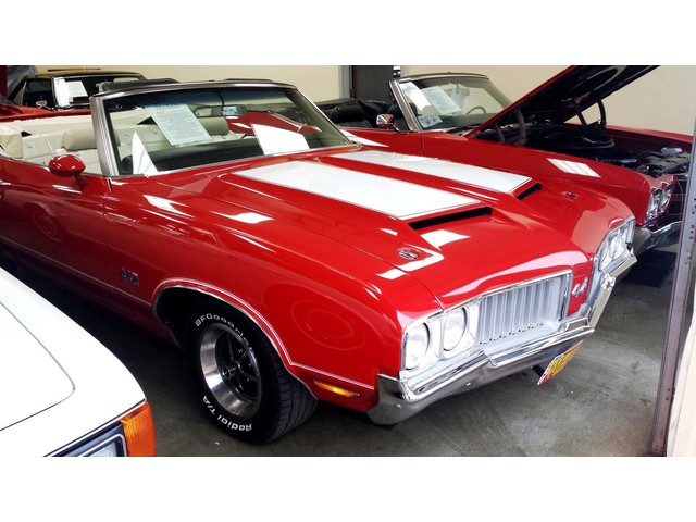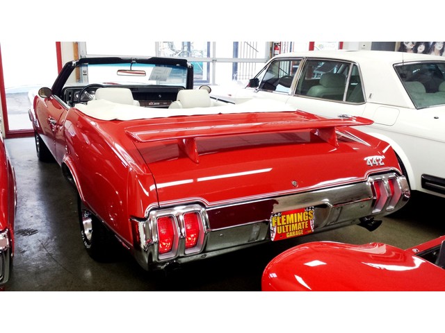 Fleming’s Ultimate Garage, the USA’s largest volume classic and specialty car dealership, is proud to offer this spectacular and absolutely authentic 1970 Olds 442 Convertible. This stunning musclecar was treated to a full nut & bolt restoration a few short years back and has been driven very sparingly since. In fact, it has been driven very sparingly since it was new….we hold an actual mileage title that authenticates the 14,936 miles showing on the odometer to be original! The car was originally purchased, titled and registered to a corporation (perhaps for a tax write-off?) and for some reason, never really got driven. It presumably sat indoors for many years, with nobody paying much attention to the brute for many years before it was painstakingly restored to its original glory. We belive the carpets and upholstery are all original. Take a close look at the pictures of this spectacular car! This is not a trailer queen; rather, it was restored to DRIVE! For you trailer queen guys who are willing to forgo the driving experience and tow your 442 convertible around in a trailer worrying about whether a car is all numbers matching and that it has date correct 1970 air in the 45 year old belted tires, this is not the car for you. What this car happens to be is a very rare (1 of only 549 total 1970 442 convertibles built) with documented original miles of less than 15,000), a correct but not numbers matching, professionally rebuilt 455 engine with correct Ram-Air, factory 4-speed transmission (how many of these can be left?), factory Hurst shifter, original owner’s warranty portfolio with Protect-O-Plate, finished in its original color with white top, parchment interior, matching boot and Super Stock 1 wheels. This 442 convertible is without a doubt one of the finest we have ever had with exceptionally nice, mirror-finish, correctly coded (original) Fire Red paint in lustrous base coat/clear coat laid down on top of laser straight body panels. The paint is not perfect but I would give it a strong 8 ½ to 9 out of 10; if it were any nicer, you wouldn’t be able to drive it! The original fiberglass Ram-Air hood with white stripes (painted on and cleared over) really make the car “pop”. It is the ultimate cruiser with drop dead gorgeous good looks and period correct high-performance 455 c.i.d. / 365 hp engine that we estimate has at least 425 hp based on how well this Olds runs. The car is also equipped with a power convertible top, fast ratio power steering, power disc brakes (front), bucket seats, console, 4-spoke sport steering wheel w/ tilt column, factory A/C, Rocket Rally Pack with tick-tock tach, factory AM/FM Stereo Radio (not working), stock “Superstock 1” wheels mounted on brand new BF Goodrich Radial T/A Raised White Lettered  tires, beautiful chrome and stainless trim, moldings, etc. The Muncie 4-speed shifts flawlessly and the clutch feels perfect. The are no known mechanical issues with this car. It is ready to rock! The original (rebuilt) rear end with the W-27 finned aluminum cover is packed with a 3.91 Posi-Traction gearset; a factory option on the 1970 442. We have the original 3.42:1 ring & pinion in a box and it will go with the car in case you like your speeds high and your rpm’s lower. This car runs, looks, handles and sounds GREAT and with the 3.91’s, it is an ANIMAL! It is truly an iconic piece of American musclecar history that begs to be driven! In fact, many enthusiasts recognize the 442’s as the best riding musclecars ever built and this one is no exception.