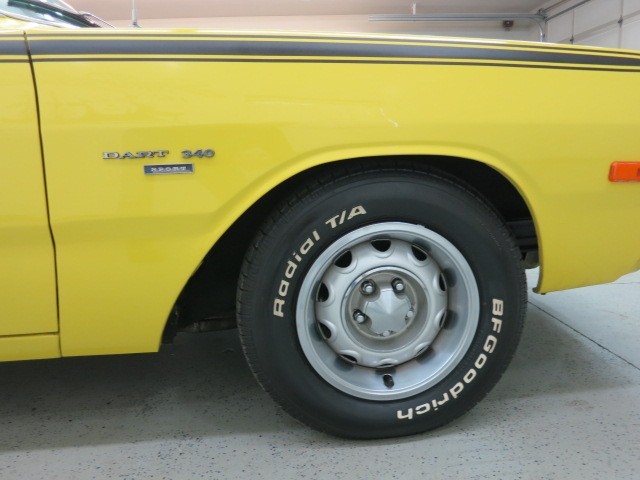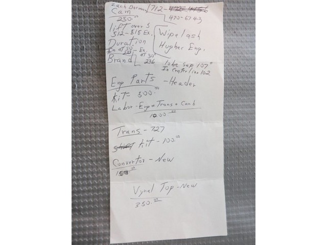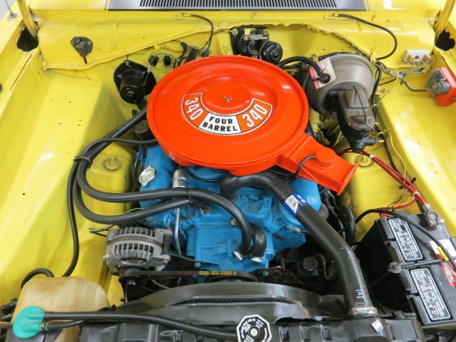 It is also complimented with a long list of factory equipped options that include the original, #'s matching, 340 C.I. / 240 + H.P.and re-built 4 barrel carb. w/ "Hughes Whiplash" cam w/ Intake 50/223 / Exhaust 30/236 ...a freshly re-built engine w/ headers and also rebuilt "Torque Flight" Automatic Transmission, new converter and shift kit. Has a 3:21 ratio "Sure Grip" axle, Pwr. Steering, New brake booster,new radiator, Power Disc Frt. Brakes, Dual Racing Mirrors (remote), Black-Out Performance Roof line to Body Side Stripe, Hood with Scoops, Fender Mounted Turn Signals, Dual Exhaust with Chrome Tips, AM Push Button Radio,Bench seat, Rally Wheels, *A/C , vinyl roof w/ ** 1st. year offered Factory Sunroof !!