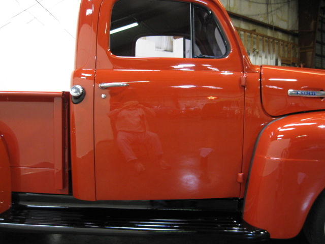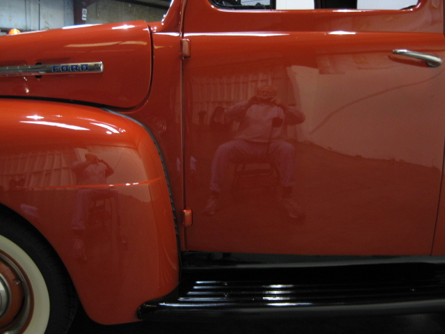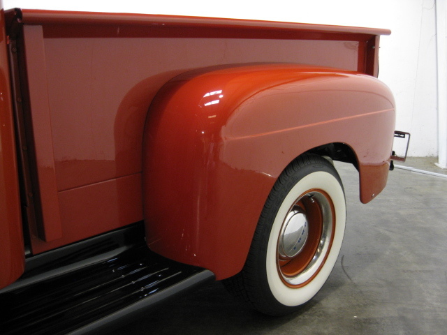 In 1951 Ford introduced a new front end, gone was a smiling horizontal-bar grille and inboard headlamps it was now replaced by a single-bar grille with three massive teeth along with a wrap around front bumper, this gave the truck a more aggressive frontal appearance. The fenders were revised to house the new grille work and the headlamps were moved farther outboard, the fenders being somewhat taller allowed the hood to adopt a flatter, more modern appearance. Ford accentuated this smoother look with a low air scoop in the lower front of the hood, replacing the high "nostrils" of the 1948-1950 design.