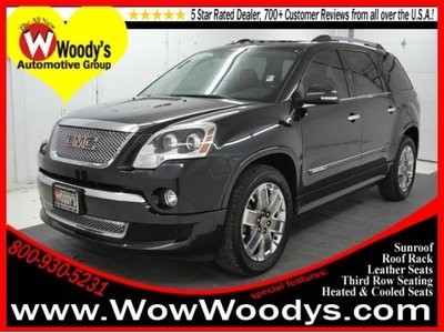 *One Owner FWD 3.6L V6 Sunroof, Leather & Heated Seats, Quad Seating, 3rd Row Seating, CD Stereo w/Aux, Back-up Camera, Back-up Sensors, Power Adjustable Seat w/Memory Positions, Power Liftgate, Rear Spoiler, Roof Rack, Certified Warranty. This 2011 Acadia is for GMC fans looking the world over for a fully-loaded gem. You really gotta love this SUV. If you wanted extras, it's got 'em, and we're not just talking extra cupholders here. New Car Test Drive said, ''...With its pleasant manners, considerable space and good fuel economy, the Acadia is a good crossover choice: better than a truck-based SUV for anyone who doesn't need to tow a heavy trailer...'' Designated by Consumer Guide as a Midsize SUV Best Buy in 2011.Price includes $500 instant rebate when financed through a Woody's Lender. 11A689-498Click here to read why we're different! Woody's is an Honest, Up-Front, One Price Dealership selling used cars in the greater Kansas City area. Check out what over 1000 customers are saying at wowwoodys.com When it comes to Price, we're third party verified among the lowest In The Nation! This vehicle is certified with a *Pre-Owned Warranty* at no cost to you! Not sure which vehicle you want? With the largest, most diverse inventory in Middle America you can view all makes in one location! Check out our website to see 800+ vehicles with Free Carfax Reports, 50+ Pictures, Videos and more! www.wowwoodys.comThe majority of our vehicles qualify for Woody's Assurance Program which includes a 12 Month Return Policy, Limitations Apply, See Dealer for Details.Some of our customers say, Help me find a car or just find me a car We can find you any used car, used truck, used suv. Plus, We will pick you up at the airport or ship your vehicle to you! Our award winning Finance Management Team works with over 15 local and national banks to get you the best rate and term. If you would like to save time just visit our wowwoodys.com website to access our Online Secure Credit Application. We also offer an online payment calculator so you can setup different down payment/monthly payment options.For more great vehicles like this one, check out ** http://www.wowwoodys.com/inventory/newsearch/Used/ **[Image]