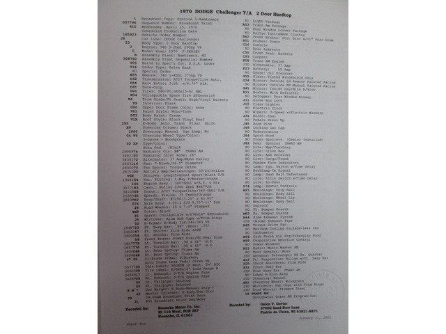 1970 DODGE CHALLENGER T/A REAL DEAL VERIFIED BY GALEN GOVIER. We have the report that was done in 2002. see pics of report on vin and build breakdown.  Paint code was DY3 Cream. speedo shows 7,559 miles but cannot verify. The Challenger is on a California Title and is where the present owner got the car. This car looks very solid body wise and very solid underneath. Has transmission and rearend NO engine comes with this car. Has the original Hood and decklid with spoiler. Would be a great car to restore not many real T/A Challenger left to restore out there. Please Call John Gastman at Roanoke Motors at 309-923-7171 with questions