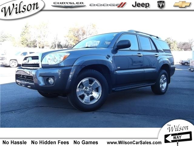 The Toyota 4Runner has revised exterior styling for 2006\, highlighted by new bumpers\, lamps\, grille and lower cladding. Redesigned for 2003\, the Toyota 4Runner is now in its fourth generation\, and that says a lot about the popularity of this midsize Toyota SUV Powerful engine lineup\, well-mannered on pavement\, above-average off-road capability\, comfortable and well-trimmed cabin\, long list of standard equipment. There are also new 18-inch alloy wheels for the Limited model and a new roof rack and tube steps for the Sport Edition. Toyota has also thickened the 4Runner's windshield and front window glass for reduced wind noise. In terms of new standard features\, there's now an auxiliary audio jack for portable devices and power seating for the Sport and SR5 V8\, and a seat memory feature and a six-disc CD changer for the Limited. Wilson Chrysler Jeep Dodge Ram Chevrolet located in Winnsboro\, SC 29180; just 15 minutes from Killian Rd\, Columbia Sc. There is only way to shop and buy your next vehicle\, The Wilson Way! If you are in Columbia\, SC; Blythewood\, SC; Lexington\, SC; West Columbia\, SC; Newberry\, SC; Chapin\, SC; Batesburg\, SC; Leesville\, SC; Rock Hill\, SC; Chester\, SC; Lugoff\, SC; Elgin\, SC; Camden\, SC come shop us at www.WilsonCarSales.com. New car sales and service for Columbia\, SC. Used car sales and service for C