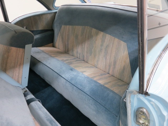 Interior is deluxe fabric in Med Blue w/ Lt. Gray design. All new ...head liner, door panels, seating and carpeting. The chrome and stainless all professionally done and amazing !!  A solid foundation car from Missouri, the body is solid and straight ( no perforation) and with no waves.