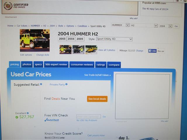 All right you would not be looking at this listing if you did not want a HUMMER H2 so let me tell you about this great H2!  It is a 2004 HUMMER H2 with only 52,015 miles on it! It is Victory Red with Wheat Leather, the front bucket seats are dual power, power lumbar, heated and drivers side memory and it has a 3rd row seat!  It is the 1SB Adventure Series which gives you the air ride along with built in air compressor that gives you the ability to air up your tires after playing off road.  The 1SB Adventure Series also includes Rubber Mudder Floor Mats, a BOSE AM FM 6 Disc in dash CD changer, tool kit with lamp,  Black Brush Guard which has been upgraded to a Chrome Brush Guard,  Roof Luggage Rack with Crossbars & an option code YE2 that I could not decode.  It has the sunroof to further enjoy the outdoors!  It has tons of factory chrome!  One package includes brushed aluminum double crossbar roof rack, chrome exterior door handles, chrome mirror caps and license plate surround and the other package includes chrome hood handles and chrome hood latches.  There are  4 other seperate optional chrome items which are chrome 17" alloy wheels, chrome taillamp guards, chrome step tubes and a chrome gas flap door.  The chrome alloys are riding on near new set of correct tires.  It has the removable 3rd row seat that when it is removed along with the exterior spare carrier gives you a lot of cargo space.  This is as pretty an H2 as I have ever seen and I really like it not having the 1SC package because you could only get the Ebony interior with it and in my opinion this is much prettie with the Wheat leather and much cooler in the summer.  It drives out great and does every thing the way you want it to.  It has the owners manual along with both keys and remotes with it.  The appearance of this neat rig says volumes about how it has been maintained along with a clean accident free Car Fax showing only 3 owners in its 10 year life!  The Car Fax shows the 1st two owners where in Florida and the last owner lived Tennessee, it also shows a lot of the services that have been peformed, if you would like a copy of the Car Fax just give me a call, it is toll free and tell me where to e-mail or fax it to, the Car Fax reports are too hard to read in the photos that I have taken for listing in the past so I now just do a close up of the front page.  Enjoy the pictures and video but feel free to call for more info!