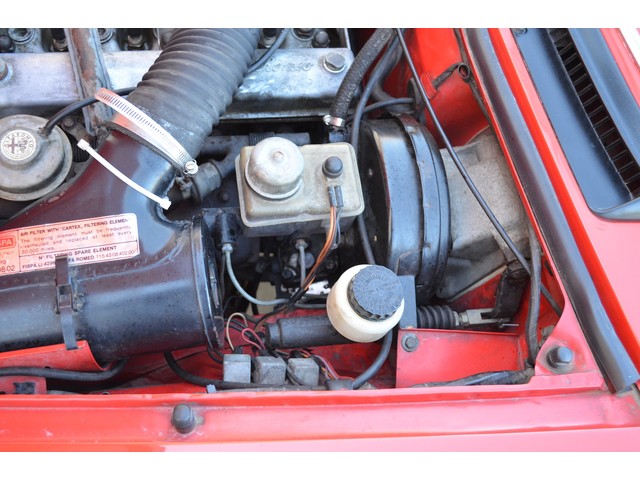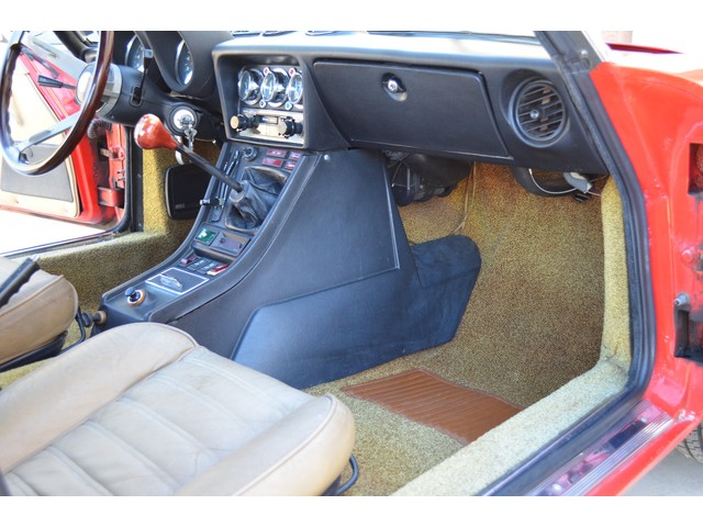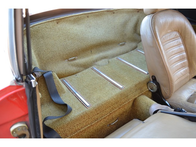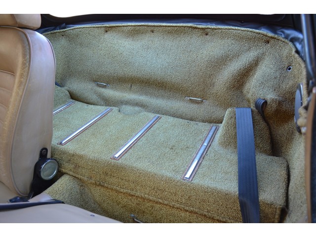 The original leather is the supple tan Italian glove leather. It has the normal age cracking and shows some wear but has no tearing. The carpet is all original and very cool!! Even the dash is remarkable with no cracking whatsver. This Alfa has been garaged since new and is a fantastic survivor. We have installed a new correct tan canvas convertible top and the Alfa comes complete with the original tan top boot.