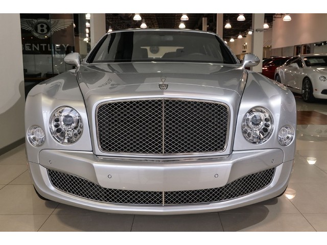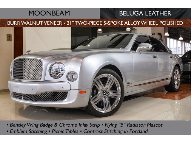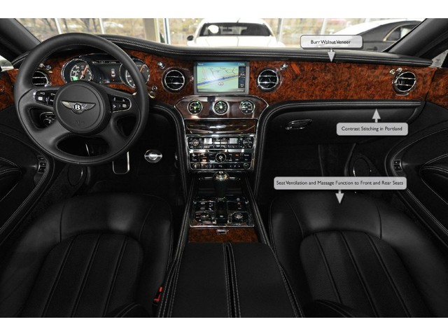 2013 Bentley Mulsanne in Moonbeam with Beluga hide interior and Burr Walnut Veneer. Additional features include Contrast Stitching in Portland, Emblem Stitching, Bentley Wing Badge & Chrome Inlay Strip to Waistrails & Badge to Facia, Rear Quarter Vanity Mirrors with Veneer Surround, Premier Specification, Ambient Interior Mood Lighting, Bright Stainless Steel Door Pillar Finisher, Bright Stainless Steel Matrix to Lower Bumper Apertures and Front Wing Vents, Flying 'B' Radiator Mascot, iPod Interface and Leads With Hand Stitched Leather Storage Case, Jewel Fuel Filler Cap, Rear View Camera, Seat Ventilation and Massage Function to Front and Rear Seats, Shade Band to Tinted Windscreen and 21" Two-Piece 5-Spoke Alloy Wheel - Polished. MSRP $329,335