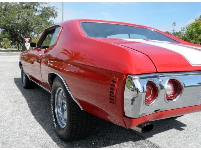 1972 Chevrolet Chevelle for Sale. Numbers matching 350 engine block, automatic transmission, Edelbrock aluminum intake, Holley 4 barrel carburetor, ceramic coated headers, 3 dual exhaust, A/C, power steering, power disc brakes, chrome plated American Racing Torque Thrust II wheels with BF Goodrich Radial T/A tires, red exterior with custom rally stripe package, cowl hood, dual sport mirrors, white bucket seat interior, console with floor shift, Grant steering wheel, shoulder belts, Pioneer AM/FM sound system with amplifier. Check out this beautiful Chevrolet! Looks and sounds great!