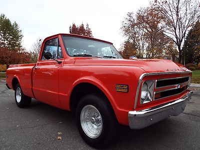 This is a NICE - DRY - SOLID - Idaho High Mountain Desert - western  truck and it shows !! In my opinion your not going to find much nicer ORIGINAL FLOORS than the ones that are on this BEAUTY, UNBELEIVABLE !! The EYE POPPING BEAUTIFUL Hugger Orange  exterior paint is in VERY NICE shape with really little to no wear showing other than a few small chips and is still bright and shiny and looks STUNNING as you can clearly see in the video above and the 100 pictures below. This Chevy C10 Short Wide Box Hotrod Pickup is nicely equipped including factory power steering, factory power brakes, dual exterior side view mirrors, good tinted glass, custom frenched in power antenna, factory gauge package with a rare factory tachometer, factory power wipers, original factory day / night rear view mirror, good heater and defroster, awesome Realistic AM /  FM / cassette player stereo radio, factory seat belts, factory back up lights, "blue dot" taillights, factory wing windows, sliding rear window and a frenched in power antenna. All of the rubber weatherstripping is soft and supple and is in good condition !! The electrical system is also all  in good working condition. This C10 is in good condition from top to bottom and from front to back. It will not disappoint someone looking for a clean example of a sought after and hard to find classic "Muscle  Truck" which is not seen at every stop light for sure. If you have been looking but cannot find a sharp '68 C10 Short Wide Box worthy of your hard earned money look NO further because this is the one! The Clean - Solid - Straight bed is also in NICE condition, you would be hard pressed to find a nicer one !! The ORIGINAL chrome and stainless steel body trim is in VERY NICE condition including VERY NICE Chrome front and rear bumpers, NICE ORIGINAL stainless steel grill, NICE ORIGINAL stainless steel front trim and headlight surrounds. Check out the custom frenched in power antenna, TOO COOL !! All of the ORIGINAL light lenses and reflectors are clear, bright, UNCRACKED and look BEAUTIFUL !! Check out the AWESOME  "Ultra" billet centerline  wheels wrapped in nearly new Kelly steel belted radial tires !! Boy does this combination look OUTSTANDING on this truck and give it that mean "Muscle Truck" look !! This vehicle is in GREAT mechanical condition and it runs and drives very well. It is solid with respect to the overall mechanical condition as well as the overall cosmetic  impression. I looked underneath and included 100 photos below some of which show the undercarriage. Again this is a NICE - SOLID - DRY - Idaho High Mountain Desert - Western truck!