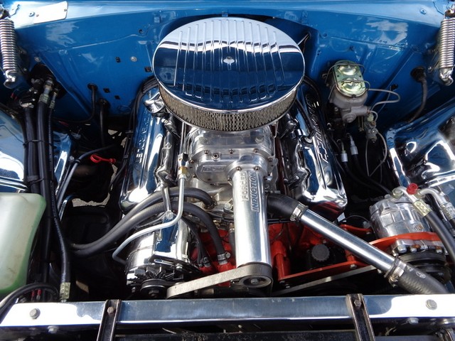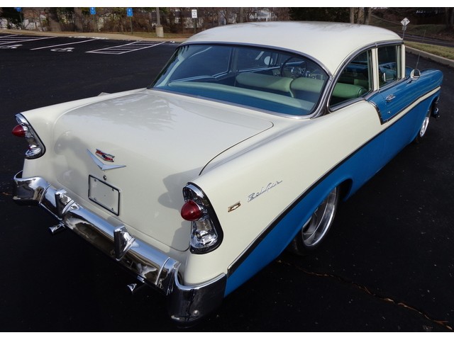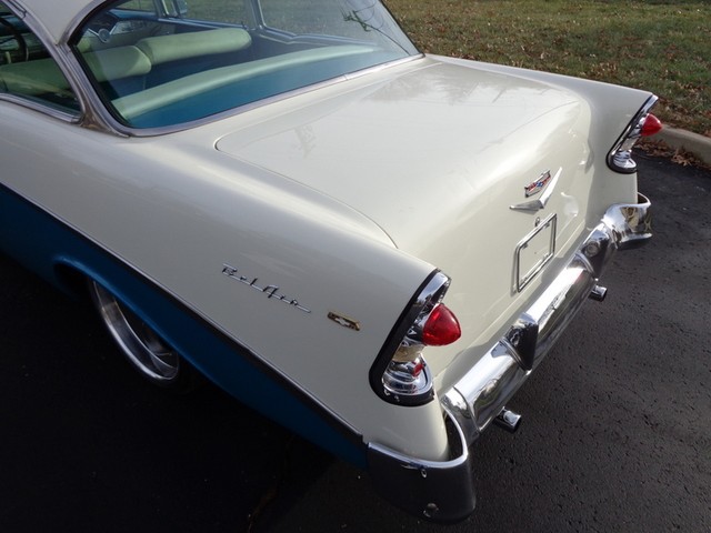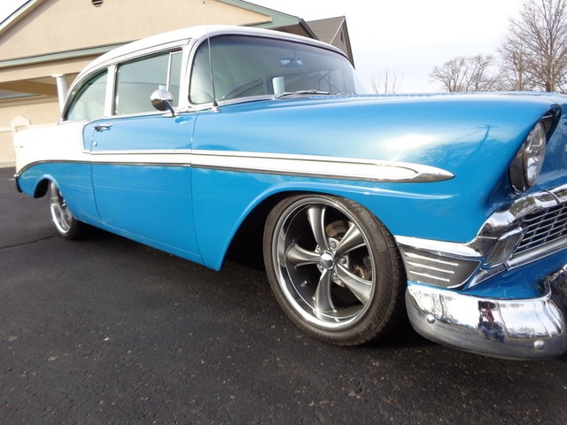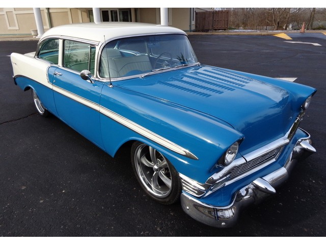 This is a excellent example of a true California car, a 1956 Chevrolet 210 Bel Air restomod  where old meets new! Finished in a stunning color combination of two tone blue & white and the paint is bas coat clear coat with a excellent shine and mirror like finish! All of the body panels are straight as can be with a excellent fit & finish! Powered by a strong Big Block 396 v8 with a B&M under the hood Blower pushing close to 500 hp and mated to a close ratio four speed manual transmission! There is a Bullet proof Ford  Nine inch rear end with 3.50 gears, front and rear sway bars, two inch drop spindles in the front , lower blocks in the rear, four wheel disc brakes, vintage heat, vintage Air conditioning, tilt wheel , Billet steering wheel, custom matching interior , 18" x 8" Boss wheels 225/45ZR tires on the front , 20" X 10" Boss wheels 275/30ZR20 tires in the rear. This vehicle was built to be driven and is a Blast to drive! Sold on a California title and ready for a new owner to enjoy this 56 chevy! Call 314-346-6039 with any questions , offers or directions 314-346-6039.