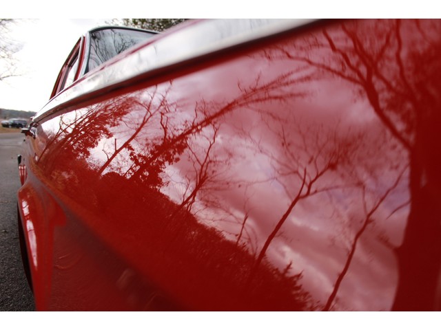 Finally, we will take a look at the heartbeat of the Chevy. When you look under the hood the inner fenders and firewall have been painted to match the car. The engine is a 327 V8 that has been dressed with an Aluminum Intake and Valve covers. All the brackets and engine was also painted red. It has a set of Short Headers and set of Flows to give it a good sound. The trans is a 350 Turbo and the rear end looks to be stock. The help the car stop better it has new Power Brakes with the dual Master cylinder.
