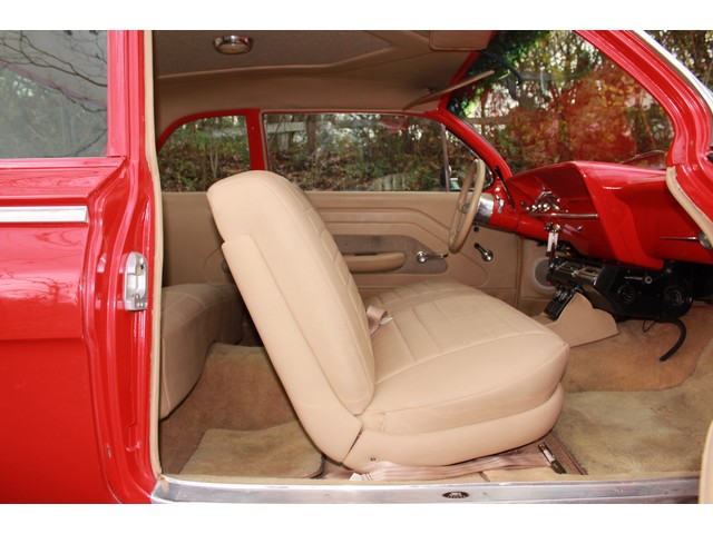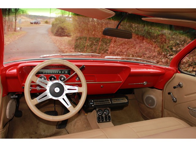 Next, we will move to the interior of the ’62. When you look inside this Chevy it’s easy to see the same eye for detail. It’s all been redone in Beige Leather Interior with custom door panels and a one off headliner. The dash and steel trim is painted to match the exterior and helps make for a perfect transition between exterior and interior. As you can see by the pics it has add on A/C and when you open the glove box it has a CD Player. There was many hours spent on the fit and finish of the headliner and the door panels. The eye for detail carries over to the trunk with all custom panels as well as carpet. The controls for the air ride have been mounted to the AC unit and trimmed out with a mini console.