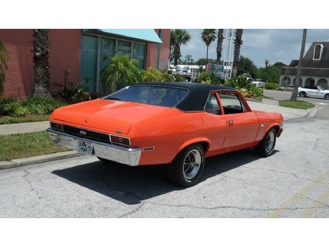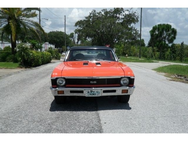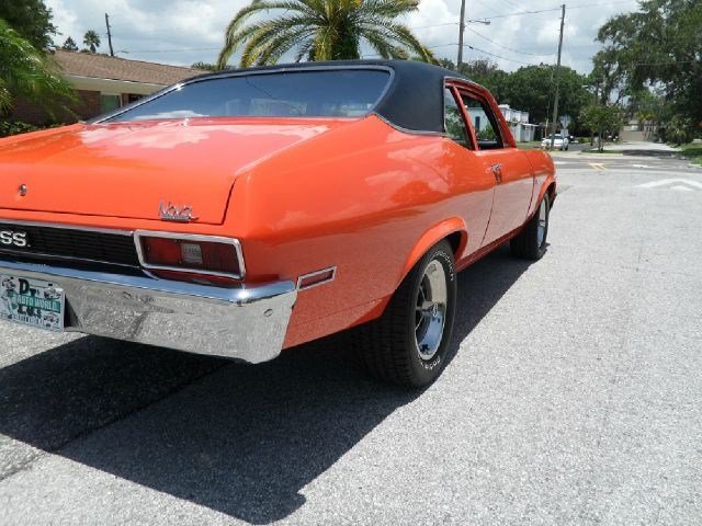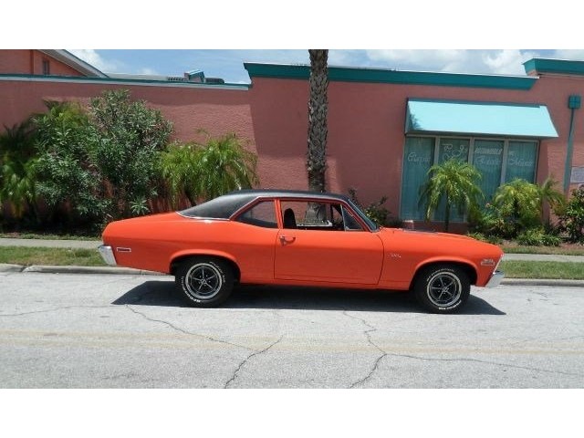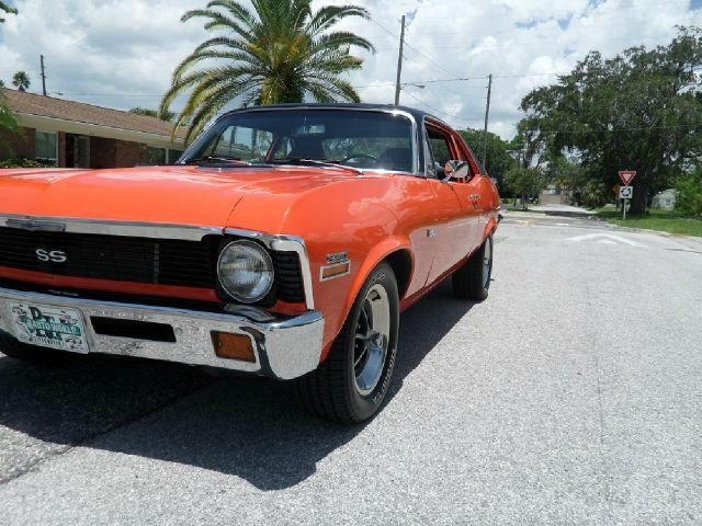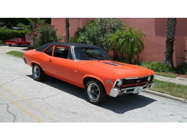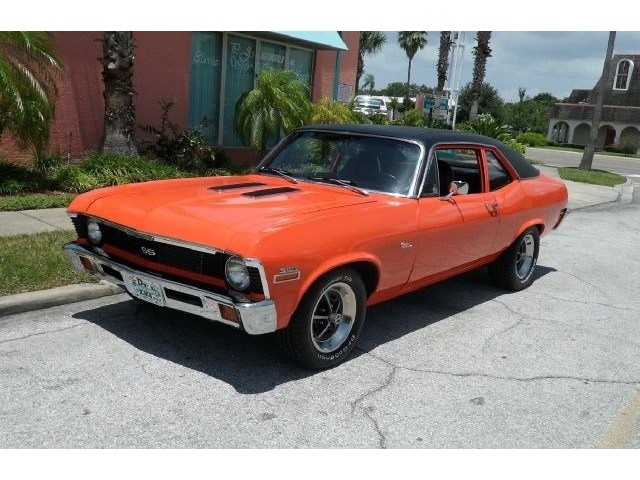 1972 Chevrolet Nova For Sale. 5.0L V8 engine, Muncie 4 speed manual transmission with Hurst shifter, Holley 4 barrel carburetor, Edelbrock aluminum intake, HEI ignition, aluminum radiator, header dual exhaust, Magnum 500 wheels with BF Goodrich Radial T/A tires, orange exterior, black vinyl top, SS trim, bucket seats, axillary gauges, Sony AM/FM/CD/AUX radio. This great looking Nova is a real eye catcher, don't miss it!!!