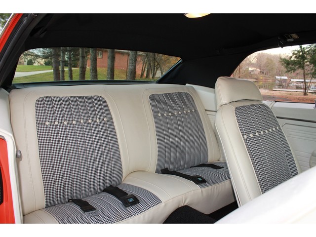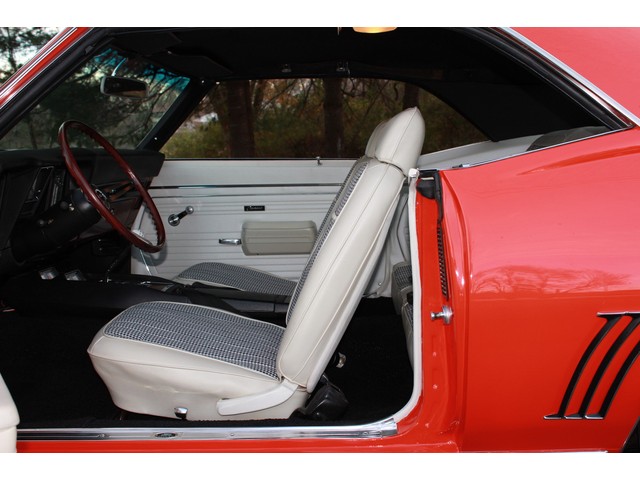 Next we will take a look at the interior of the ’69. It is all done in the White Houndstooth and provides an excellent complement to the exterior scheme. This Camaro has the correct seats and gauge pack console. When you look at the dash it looks like new and features the in tach Dash. Also, it has a Tilt column with the Rose Wood wheel. This is a radio delete car but does have the wood grain accent dash and console. The final interior touch is the correct seatbelts for the front and back.