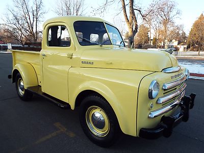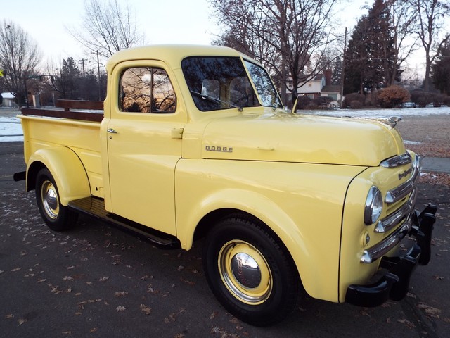 WOW ! This BEAUTIFUL - RARE - '49 Dodge B-Series - "Pilothouse Cab" - 1/2 Ton Pickup is too cool ! If you have been thinking of restoring a truck, you know what it costs to do a restoration like this not to mention the hundreds of hours involved ! Careful to not let this one get away ! Sun Yellow with Black running boards has got to be the very best color combination for this model Dodge pickup !! We just purchased this truck from a local retired collector who has just sold his home. He and his wife bought a motorhome that they are going to live and travel in so they had no place to keep this BEAUTY, LUCKY YOU !! As you can clearly see in the pictures this was his pride and joy for sure !! He told us several times that this truck has 94,845 ACTUAL - ORIGINAL MILES since brand new  and yes we do have an odometer statement !! He also told us that this truck was bought brand new in Washington state and has had three Washington owners and then he bought the truck making him the fourth owner and he brought it to Idaho. It still retains its ORIGINAL 1949 Washington license plate that was first put on the truck when bought brand new !! He had a restoration done several years ago removing everything from the frame except the cab which he told us just didn't need to be removed as it looked GREAT ! This is a NICE - SOLID - DRY - ALL STEEL - Washington State - Idaho high mountain desert - Western truck that runs and drives WELL ! This pickup still retains it's - FACTORY ORIGINAL - correctly mounted Dodge drivers side door jam mounted data plate and a Dodge B-Series driver's manual, both of which are shown in a two pictures below. What a value it is at the reserve price which is set well below the restoration costs ! If you can make it to Boise in the next ten days please come look at and drive this Beauty for yourself, you won't be disappointed !!
