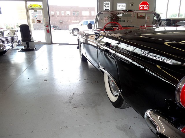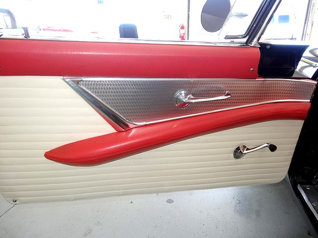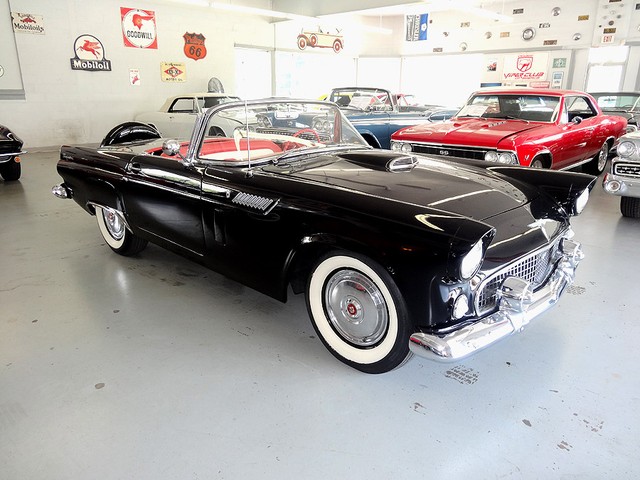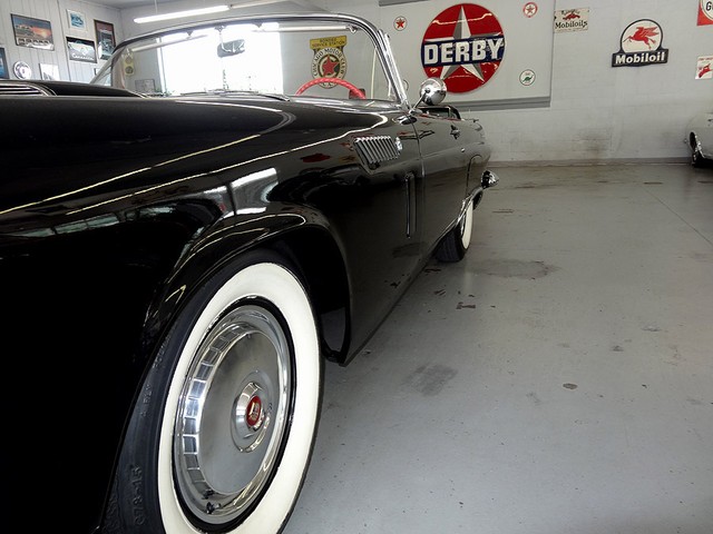1956 FORD THUNDERBIRD Roadster With both soft and hard tops. This was Fords answer to GM’s ’53 Corvette Sports Car. Features: black ext with coral/white interior. Numbers matching - 312 V8 225hp engine with factory Chrome detailing under hood. Automatic transmission with floor shifter - 4 Barrel carb with original chrome air cleaner. Power steering - Black exterior sparkles - Mostly new chrome and stainless - Glass very good - New soft top with original restored factory irons. Like new removable hard top (not the actual hard top that came with the car originally) - Highly detailed engine - Adjustable air vents in the front fenders. Factory Continental kit with spare - Fender skirts - Full Factory Deluxe hubcaps - Wide white wall tires. Dual exterior rear view mirrors - Windshield washer - All new hoses and belts. Coral/white interior, newer – headliner, door panels, carpet, everything. Tbird floor mats - After market radio - Tachometer – Clock - Heater/defroster - Seat belts. Comes with Owners Manual, recent former owners’ itemized receipts totaling $40,805.15 spent restoring the car and 3 page Ford Data Decoding Instructions. 49,453 miles – believed to be original.