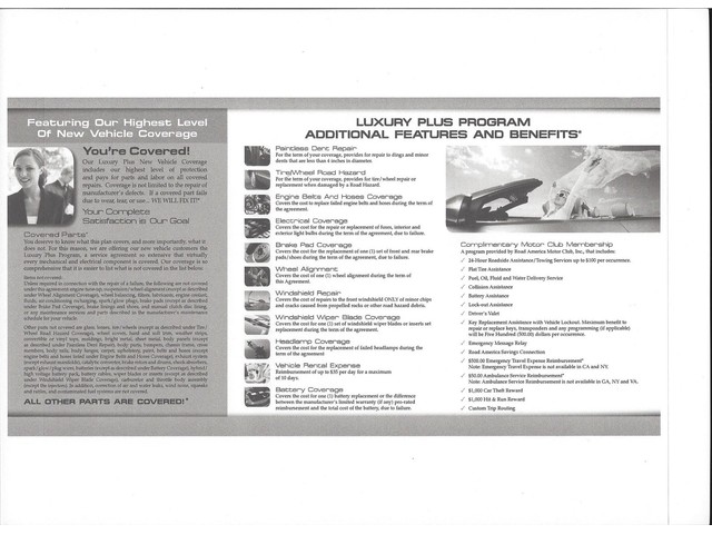 All of our new and most of our used vehicles qualify of our optional  Luxury Plus New Vehicle Coverage including our highest level of protection and pays for parts and labor on all covered repairs. Coverage is not limited to the repair of manufacturer's defects. If a covered part fails due to wear, tear, or use... We Will Fix It!