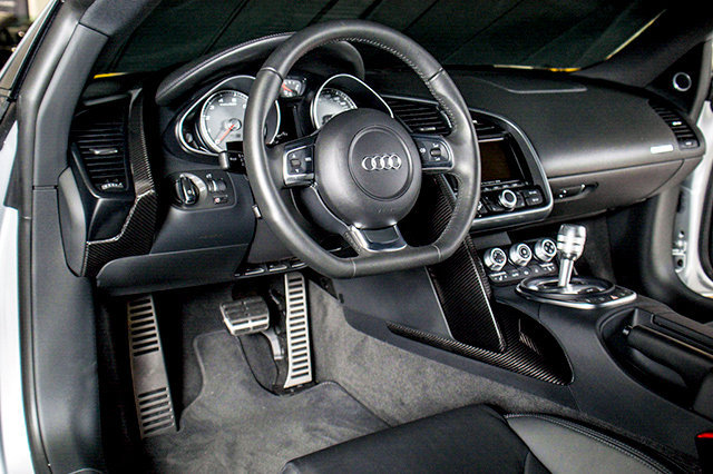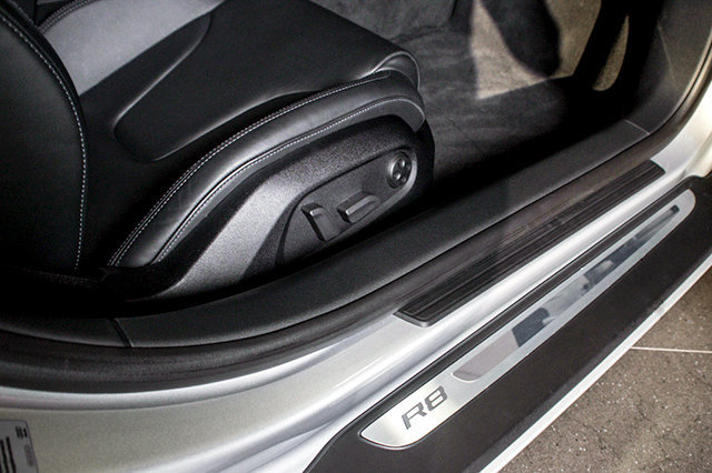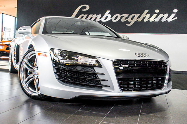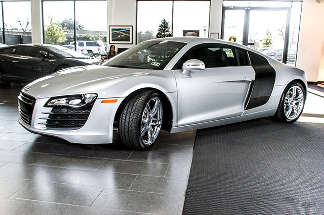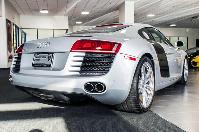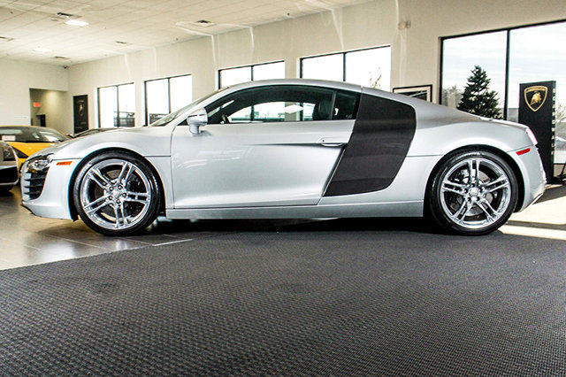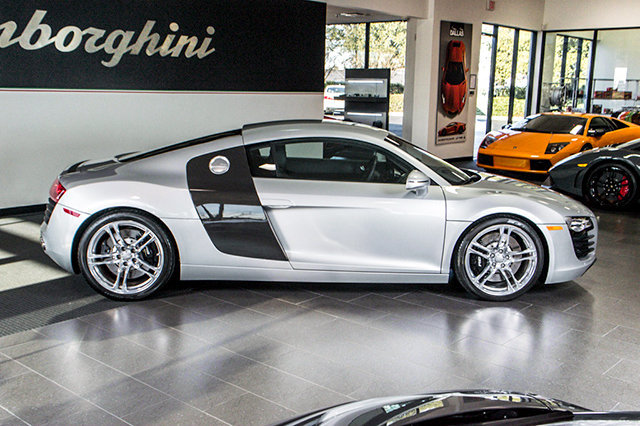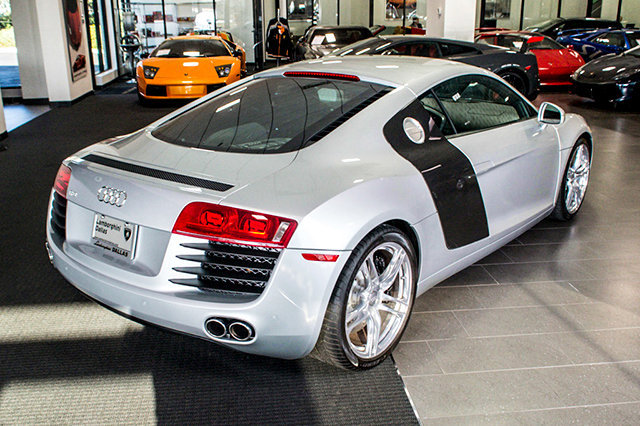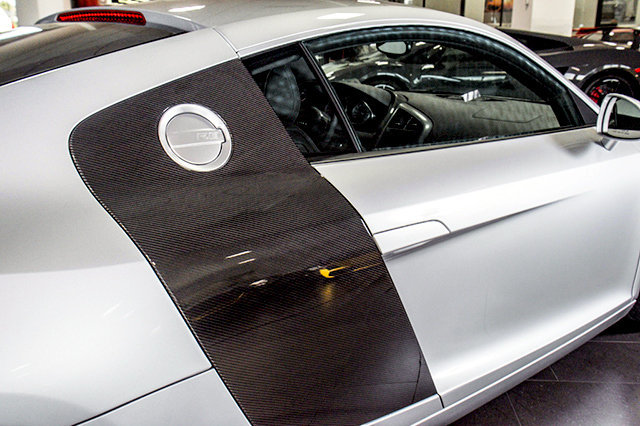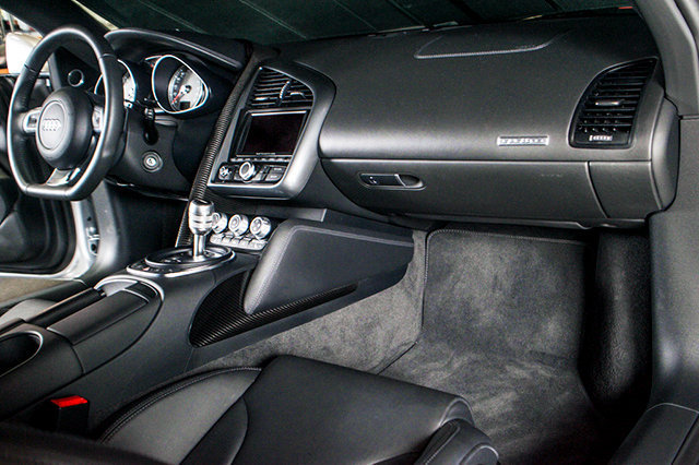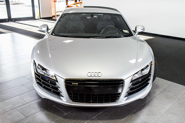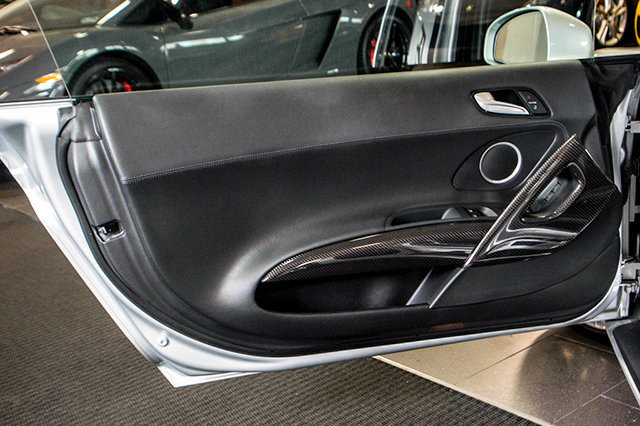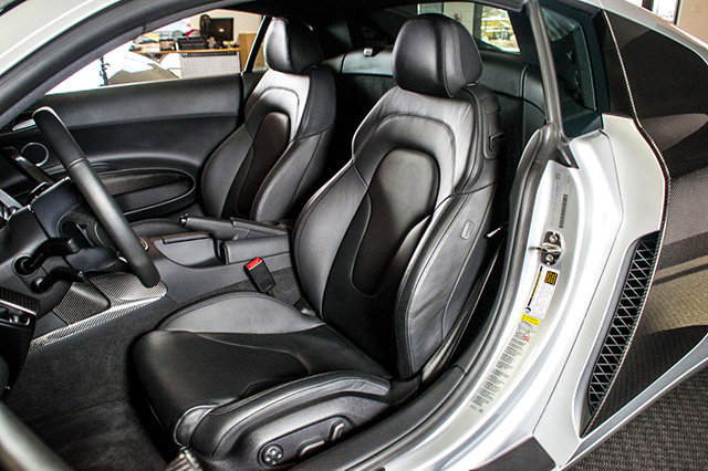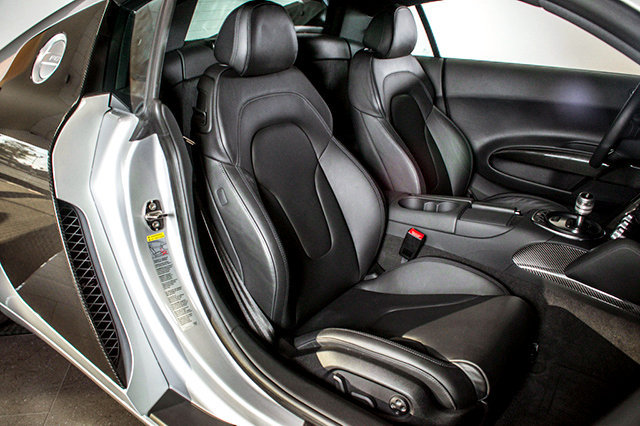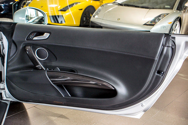 This is a smoke free Carfax certified 2009 Audi R8 Cpe, equipped with a 4.2L 420HP V8 engine and a 6-speed R-Tronic (Auto & Paddle shift) transmission. This car is finished in a sharp Ice Silver Metallic exterior color and Black full leather interior along with Carbon Fiber trim throughout.