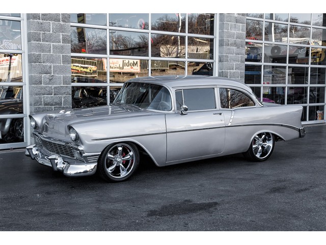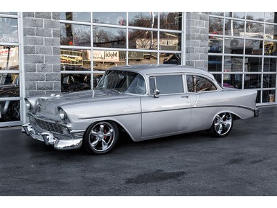 This 1956 Chevrolet 210 Tudor has a 350 C.I. Holley 4bbl V8, 700R4 Automatic Transmission, Custom Silver Metallic Paint, Custom Tan Two Tone Interior, Tinted Windows, AM/FM Radio, Power Steering, Power 4 Wheel Disc Brakes, Vintage Air Conditioning & Heat System, Digital Dash, Dual Mirrors, Leather Wrapped Steering Wheel w/ Tilt Column, 9 Bolt Rear End w/ 3.75:1 Ratio, Chrome 20”/ 18” Wheels w/ Nitto Radials, Optima Red Top Battery, K & N Air Filter, Electric Cooling Fan, Chrome Alternator, New Chrome Bumpers & Trim, Dual Stainless Exhaust, Power Bench Seat, Beautiful Tri-Five Chevy Custom That Has All The Options & Look You Could Ask For!