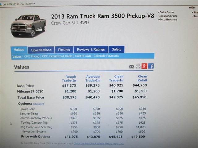 Ok here is a very unique 2013 Ram 3500 Dually with just 7,088 miles on it and it is like new in and out in every respect and manner!  It is a SLT Big Horn with lots of options.  Of course it has the well respected 6.7 Cummins Turbo Diesel with a 6 Speed Manually Shiftable automatic transmission.   The color combo is a Deep Cherry Red Metallic with Canyon Brown/Light Frost Beige Leather interior.  It has the front bucket seats with a center console with a power driver seat and power lumbar.   We just had Katzin Leather installed that has a better warranty than the factory leather carries, it has factory heated seats so it was a no brainer to install leather in it and it has a gorgeous interior color to begin with!  It has factory Navigation that is built into the radio screen with a back up camera. The radio screen also has tons of other things it controls including the heated seats & a heated steering wheel!  It has the factory Alcoa Alloy wheels which really look so much better than the simulators that are usually on most SLT's! This neat dually has the factory trailer brake and exhaust gas brake to help with your towing needs! It has a spray in bed liner along with a  flip ball installed in the bed already so you can just hook up to your goose neck trailer or put in the 5th wheel adapter in the goose neck reciever and hook your trailer up in minutes in the worst case scenario and roll! All this and it is a 1 owner and acdient free Ram Dually according to  Car Fax and I see no reason to doubt the Car Fax Report!