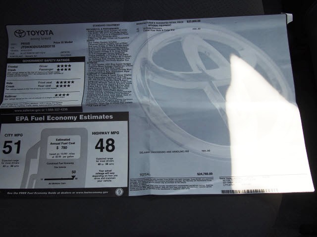 You are bidding on a 2010 Toyota Prius with 57,983 miles that has a clean Carfax report.  This Prius had great care taken from its previous owner and is now looking for its next driver to enjoy.  Nicely equipped from the factory with options as 48 mpg, Bluetooth, power mirrors, keyless entry, cruise control, CD player, including many more.  If you have been looking for a clean, well maintained Prius this is the perfect one for your needs.  Tires measure between 7-8mm, the brakes measure 5mm.  There is a very small scuff on the right underside of the front bumper that is very hard to see, otherwise no damage to speak of.  This Prius is ready to pass state inspection so please call or email today if you are interested in ending the auction early.