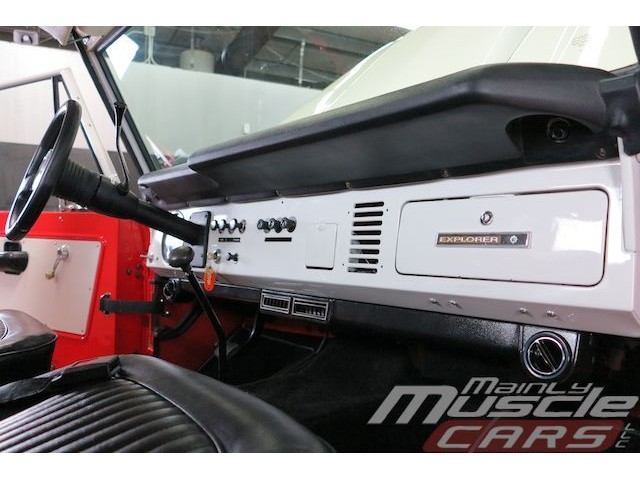 Inside the bucket seats are in excellent condition with nice reproduction upholstery. New carpet has been added to the front cab to keep it quiet and insulate from the heat & cold outside. The bedliner used inside also insulates sound & heat to make this a nice, quiet Bronco to drive. The metal dash was completely stripped and repainted. The bezels are in good condition and the gauges work properly.