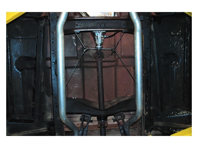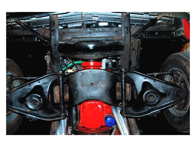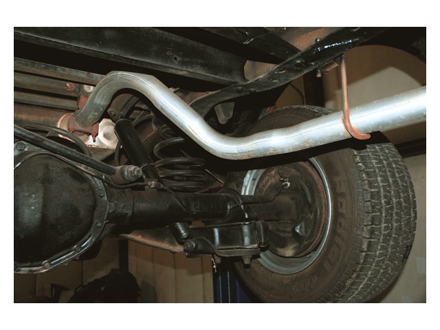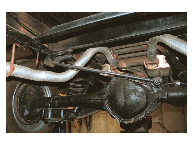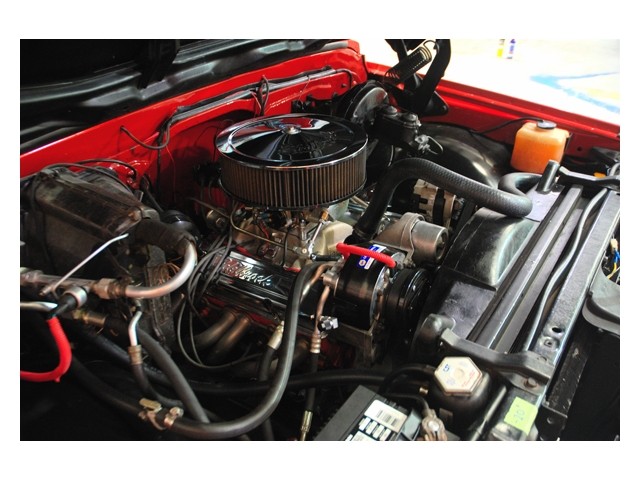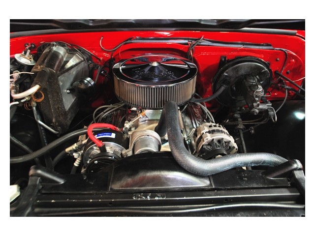 The 350 engine has been rebuild to make more power than it did in its original form. It is equipped with a nice mild cam, a Demon carburetor on an Edelbrock Performer intake. The exhaust runs through a set of headers and a 2 1/2 inch dual exhaust system with twin turbo mufflers. It sounds good but it's to loud. The turbo 400 transmission shifts very firm and runs out, as it should. The truck still has its original 12-bolt rear.