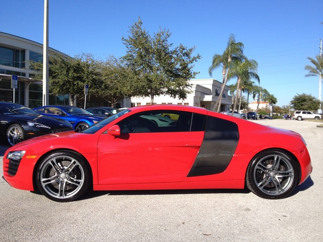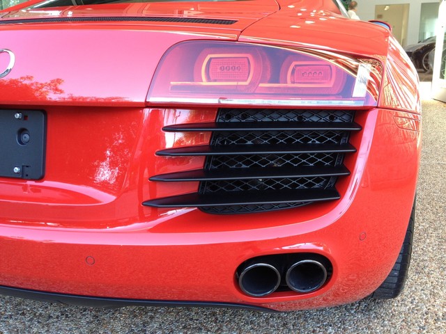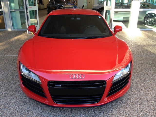 This amazing R8 is finished in Brilliant Red over a Black Leather Interior. It has a nice Options List Including: The Titanium Package - Black Optic Exterior, Piano Black Interior Inlays, Black Alcantara Headliner, Exhaust Pipe Finishers in Black and Titanium Finish, 19” Aluminum Wheels; The Convenience Package - Audi Parking System Plus, Front and Rear Acoustic Sensors, Rearview Camera, Audi Hold Assist and Power Folding Auto Dimming Mirrors; Bang & Olufsen and Audi Navigatin Plus with Ipod Connect.