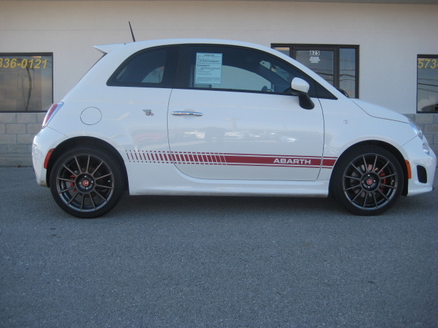 This 2012 FIAT 500 Abarth hatchback has a 1.4L turbocharged engine with 160hp @ 5,500RPM and a 5-speed manual transmission. It includes Forged Aluminum Hyper Black wheels, rear spoiler, side sill groud effects, chrome door handles, and tinted windows. If that wasnt enough it also has a Bose premium sound system, steering wheel audio controls, Turbo boost gage, aluminum pedal covers and many other options.