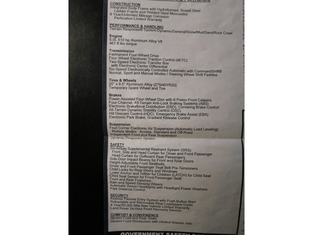 Look at our pictures and you will see a glimpse of the amazing inner structure of the cabin.  Range Rover is elegantly finished and extremely equipped for the whole crew and no matter where you sit a satisfying experience awaits you.  From the outside you will see a chiseled look and aggressive stance with the huge 22” wheels.  The power lift-gate makes your loading and unloading a little easier. After all our Range Rover is designed with your convenience in mind.  This SUV will capture onlooker’s attention and make you smile a little more…