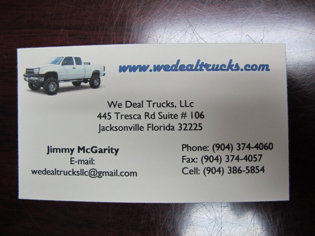 We Deal Trucks LLC is an Independent dealer located in Jacksonville, Florida (The Northeastern tip of Florida) and is here to provide our customers with Dependable used cars and trucks. We have a combined 50 Years experience in the auto industry and we use our knowledge to deal in the best used vehicles and strive to get our customers the best deal. We are able to pass the savings on to our customers because we are not located in a big retail store on a major congested highway with 90 employees to pay, instead their is 3 of us, and we all pull our own weight in the whole process to make sure you, the customer, is 100% satisfied.