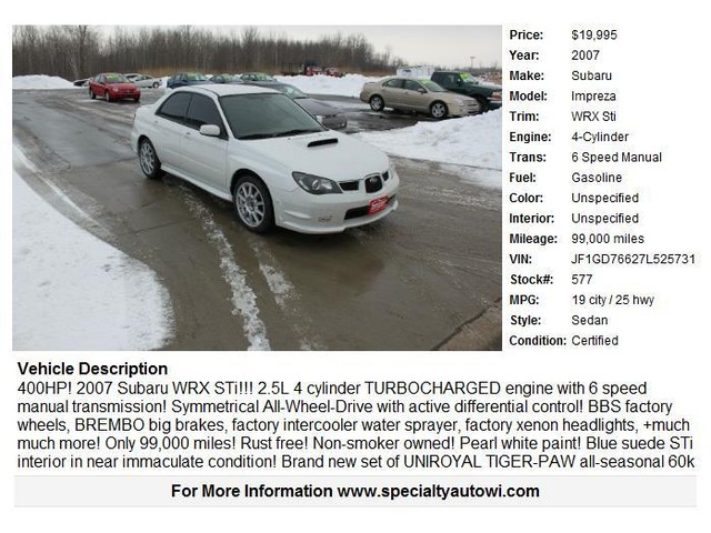 450HP(flywheel)! 2007 Subaru WRX STi!!! 2.5L 4 cylinder TURBOCHARGED engine with 6 speed manual transmission! Symmetrical All-Wheel-Drive with active differential control! BBS factory wheels, BREMBO big brakes, factory intercooler water sprayer, factory xenon headlights, +much much more! Only 99,000 miles! Rust free! Non-smoker owned! Pearl white paint! Blue suede STi interior in near immaculate condition!