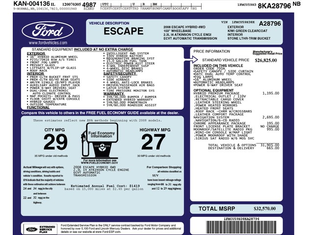 2008 FORD ESCAPE HYBRID 4WD / PREMIUM PKG / CHROME / MOONROOF / NAVIGATION