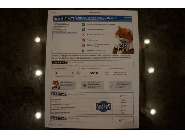 Hello and Welcome to the advertisement of Ultra Motorcars!  Up for Sale is a Xtra Clean,  1 Owner, Carfax and Auto Check Certified, Texan 2006 Honda Odyssey EX-L. This Odyssey is one of a kind, it is clean inside and out.   It is a Texan Rust Free vehicle, with absolutely no accident reports. The Auction on the eBay advertisement is a NO RESERVE AUCTION!   This means the High Bidder buys this vehicle after the Auction time period.  The title is clear and clean for this vehicle.  It was a trade in at a Local Franchise Infiniti dealership and then sold to us.  We have pulled an Auto Check and Carfax report on this  1 Owner Odyssey which clearly states, there is no accident or bad title history on this vehicle.   This vehicle has 117k highway miles, which has a great ride and drive. The engine and transmission is very solid. This vehicle has a smooth ride to it.