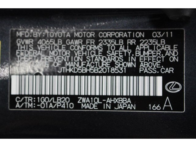 If you want an amazing deal on an amazing car that will carry all the people you care about, then take a look at this family-hauling 2011 Lexus CT. The quality of this terrific CT is sure to make it a favorite among our educated buyers. Lexus Certified Pre-Owned means you not only get the reassurance of a 3yr/100,000 mile limited warranty, but also a 161-point inspection/reconditioning, 24/7 roadside assistance, trip-interruption services, loaner car, complimentary oil/filter change, and a complete CARFAX vehicle history report. It is nicely equipped with features such as CT 200h Premium, Lexus Certified, 1.8L 4-Cylinder DOHC 16V VVT-i, CVT, Tungsten Pearl, Black w/NuLuxe Seat Material or Perforated Leather Seats, 4-Wheel Disc Brakes, 6 Speakers, ABS brakes, Air Conditioning, Alloy wheels, AM/FM/CD Player w/MP3/WMA Capability, Anti-whiplash front head restraints, Automatic temperature control, Brake assist, Bumpers: body-color, Delay-off headlights, Driver door bin, Driver vanity mirror, Dual front impact airbags, Dual front side impact airbags, Electronic Stability Control, Emergency communication system, Four wheel independent suspension, Front Bucket Seats, Front Center Armrest, Front dual zone A/C, Front fog lights, Front reading lights, Heated door mirrors, Heated Front Bucket Seats, Illuminated entry, Knee airbag, Low tire pressure warning, Occupant sensing airbag, Outside temperature display, Overhead airbag, Overhead console, Panic alarm, Passenger door bin, Passenger vanity mirror, Power door mirrors, Power driver seat, Power moonroof, Power windows, Radio data system, Rear side impact airbag, Rear window defroster, Rear window wiper, Remote keyless entry, Security system, Speed control, Speed-sensing steering, Split folding rear seat, Spoiler, Steering wheel mounted audio controls, Tachometer, Telescoping steering wheel, Tilt steering wheel, Traction control, Trip computer, Turn signal indicator mirrors, and Variably intermittent wipers.
