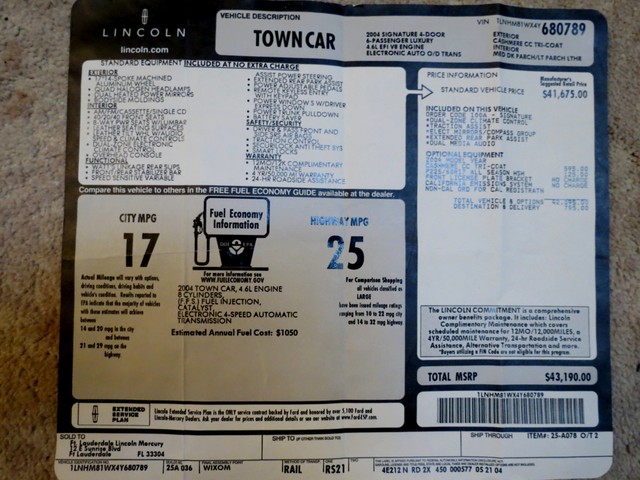 ***UP FOR A "NO RESERVE" AUCTION IS A VERY EXQUSITE 2004 LINCOLN TOWN CAR SIGNATURE SERIES--THIS IS A 1 FLORIDA OWNED VEHICLE-TRADED INTO A LOCAL LINCOLN DEALERSHIP BY A YOUNG COUPLE IN THEIR 80`s--THIS CAR WAS TRULY CARED FOR W/A GREAT NUMBER OF SERVICE RECORDS INCLUDED--SUSPENSION PUMP HAS JUST RECENTLY BEEN REPLACED ALSO..