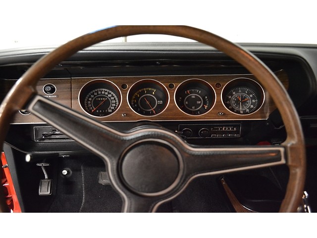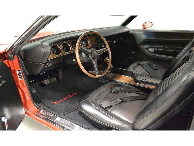 Restored several years ago, this ultimate street predator still manages to draw a lot of attention wherever it goes. Arrow-straight, the body was restored by guys who appreciated the caliber of this car, and didn’t take any shortcuts. Assembled just the way the factory would do it—not too perfect—it looks highly authentic and you’ll appreciate the level of detail that went into re-creating the proper period fit and finish. The elastomeric bumpers are in good condition with no cracks or splits, and it’s amazing how significantly they alter the car’s appearance. Despite the Hemi hockey sticks on the flanks, this is actually a fairly low-profile car for such a heavy-hitter, and the black vinyl roof surely helped lure unsuspecting prey back in the early ‘70s. Black vinyl buckets were the order of the day, and if you can touch it, it’s probably new inside this ‘Cuda. Clearly the original owner was on a mission to create a potent car that could be raced, and things like the Rally Gauges and tachometer reinforce that opinion. But then you have a wood grained center console, which is purely a stylistic choice, albeit a good one. It matches the dash, as well as the pistol-grip shifter and wood grained steering wheel, tying the interior together very nicely. Embroidered ‘Hemi’ floor mats protect the recently installed carpets, and the original R11 Music Master AM radio still lives in the dash, playing whatever it is they still broadcast on AM. In back, the trunk still carries a space-saver spare and a full jack assembly. Under that Shaker hood scoop, you’ll find a 426 cubic inch Hemi, perhaps the most feared street engine ever created. It starts easily and doesn’t smell like raw fuel like many Hemis do, and it’s happy to idle in traffic all day without getting cranky. The transmission is, of course, a 4-speed manual and this car is equipped with the A34 Super Track Pak, which includes a Dana 60 stuffed full of 4.10 gears on a Sure Grip limited slip. She has a rebuilt suspension, solid brakes, and properly undercoated floors. A correct reproduction exhaust system creates that magical Hemi soundtrack, bellowing through a set of correct chrome tips poking through the rear valence. Wheels are the original (and handsome) Rally’s wearing what appear to be NOS F60-15 Firestone Wide Oval tires. If you’re looking for a Hemi ‘Cuda you can actually drive and enjoy, you’ve just found it. The “investment grade” appraisal on many of these cars has reduced them to little more than static art, but there’s no question they were designed and built to run. Rare is the owner willing to risk his Hemi on the open road, but those who do are rewarded with a driving experience like no other. Crack all eight barrels wide open, slam the indestructible transmission through the gears, and you’ll grin like a maniac as the tires struggle to grip the pavement, all accompanied by the most spine-tingling soundtrack since Strauss’s Zarathustra spoke. These cars still trade hands for serious coin, but when you pull into a show with a real R-code Hemi under the hood, well, you just became the center of attention. Surely that’s worth something. Call today at (317) 535-3500.