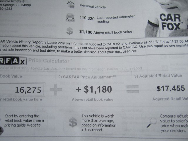 ****************PLEASE WATCH THE VIDEO AT THE END OF THIS DESCRIPTION**************ABSOLUTELY GORGEOUS 1999 TOYOTA LAND CRUSIER 4X4...IT IS A "ONE OWNER" AND HAS BEEN TAKEN CARE OF ABOUT AS WELL AS YOU CAN TAKE CARE OF ONE...I MEAN THIS LAND CRUISER IS IMMACULATE INSIDE AND OUT...IT HAS ALWAYS BEEN GARAGE KEPT AND HAS ALWAYS BEEN SERVICED AT THE TOYOTA DEALERSHIP. HAS CLEAN CARFAX AND AUTO CHECK, (THAT YOU WILL GET) AND HAS JUST HAD THE "BIG SERVICE" DONE "THE TIMING BELT REPLACED, THE WATER PUMP, THE TIMING BELT/TENSIONER/IDLER, A/C RECHARGED, NEW OIL AND FILTER, ALL THE SEALS" AT (EARL STEWART TOYOTA, LAKE PARK, FL)...IT WAS A NEW CAR TRADE AT A DEALERSHIP HERE IN FL...IT HAS A CLEAN CARFAX, ALWAYS DETAILED AND SERVICED AND YOU WILL JUST LOVE IT...IT RUNS AND RIDES LIKE IT IS STILL NEW, (JUST LIKE A TOYOTA IS SUPPOSED TO DO, THESE LAND CRUISERS ARE BULLET-PROOF AND VERY DEPENDABLE AND RELIABLE AND DESIRABLE) EVERYTHING THAT I AM AWARE OF WORKS LIKE NEW, ICE COLD A/C, THE BRAKES AND ROTORS ARE EXCELLENT, ALL THE INTERIOR LOOKS FANTASTIC, (WITH VERY LITTLE WEAR) OF COURSE IT HAS NEVER BEEN SMOKED IN, BACK SEATS HAVE HARDLY BEEN SAT IN, 3RD ROW SEATS HAVE NEVER BEEN USED...AND THE NEW OWNER WILL JUST BE BLOWN AWAY ON HOW NICE IT IS...THE EXTERIOR IS ALSO IN EXCELLENT CONDITION, THE PAINT LOOKS AND SHINES LIKE NEW, HARDLY A MARK ON IT, HAS MICHELIN TIRES AND THE FACTORY TOYOTA ALLOY WHEELS, HAS THE FACTORY RUNNING BOARDS AND LUGGAGE RACK, AND THE REAR SPOILER, AND THE SLIDING SUNROOF, HAS ALL THE OPTIONS THAT YOU CAN GET EXCEPT THE HITCH, IT HAS NEVER TOWED ANYTHING...BEING ELDERLY OWNED IT HAS BEEN USED ONLY ABOUT 7K MILES A YEAR.***************PLEASE WATCH THE VIDEO AT THE END OF THIS DESCRIPTION AND TAKE A LOOK AT ALL THE PICTURES. IF YOU HAVE ANY QUESTIONS PLEASE CALL ME  JACK @-727-460-4283 OR CAROL @-727-798-7161 OR EMAIL US. THANK YOU GOD BLESS YOU AND HAVE A GREAT DAY, WE APPRECIATE YOU AND WE APPRECIATE YOUR BUSINESS...THIS VEHICLE COULD HAVE MORE MILES ON IT BY THE END OF THIS AUCTION DUE TO DRIVING IT. IT IS A "DIVINE FIND" FOR SURE, AND YOU WILL LOVE IT:)
