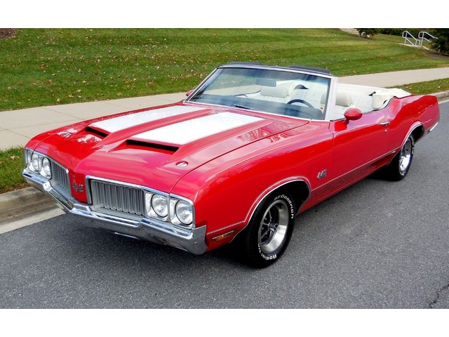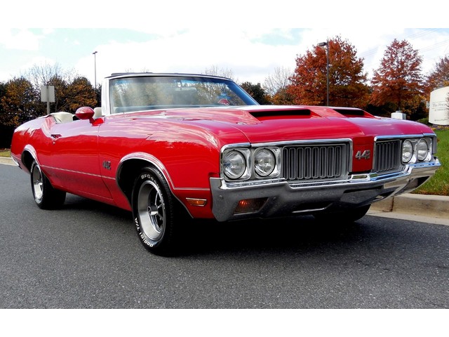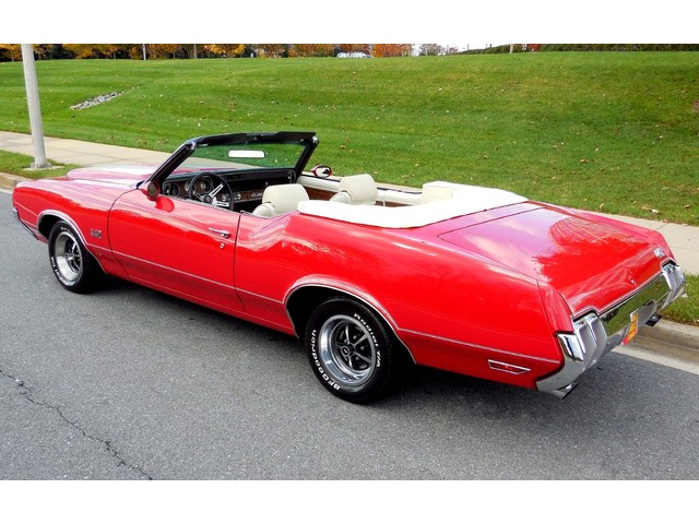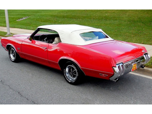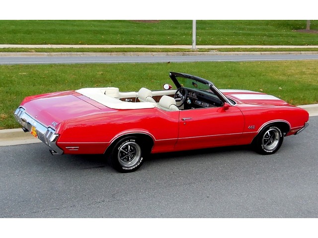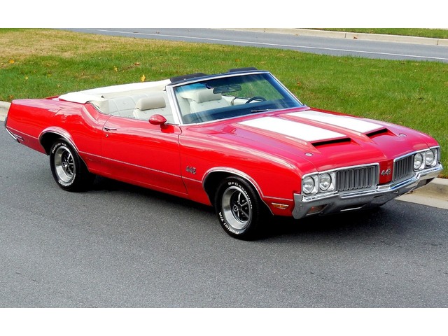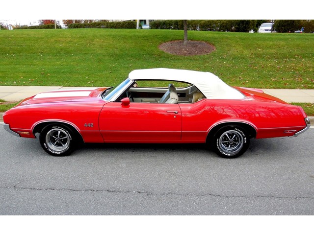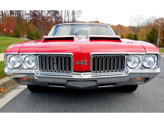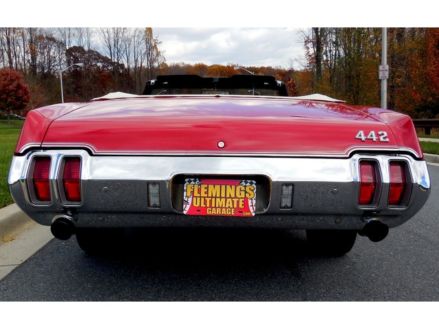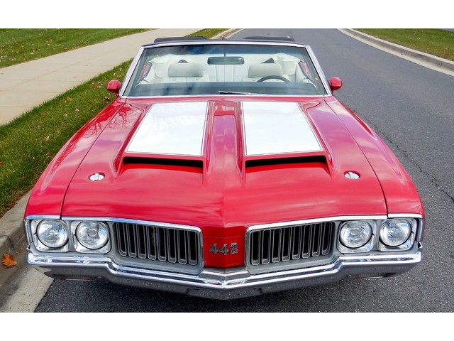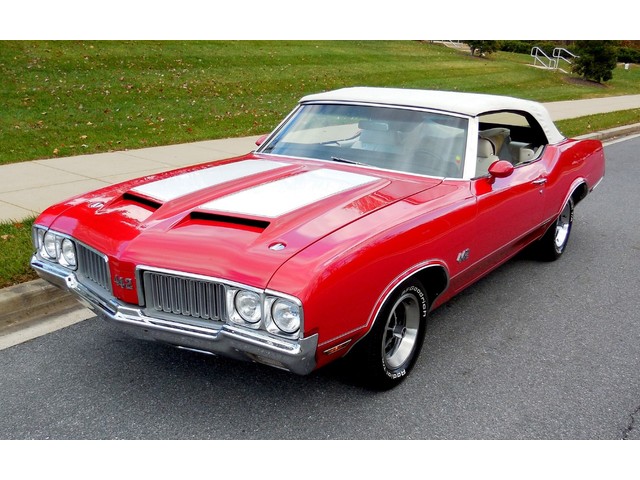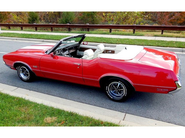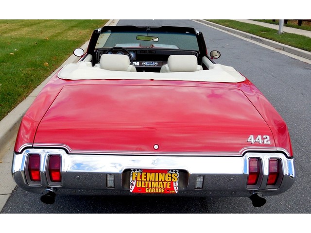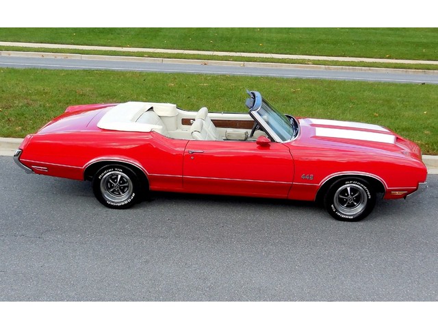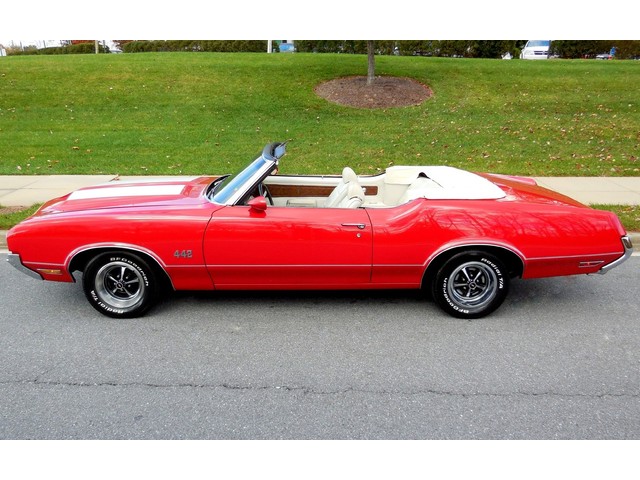 ’70 Olds 442 Convertible, Title authenticated 14,936 actual miles ! Freshly rebuilt date correct Olds Rocket 455cid V8@365hp (Now more like 425hp!) factory 4 speed close ratio transmission, factory HD 3:42 Anti-Spin (Posi) rear differential w/W-30 finned aluminum cover, correct “75” coded mirror finish Matador Red paint w/white stripes, correct coded White “Strato” bucket seat interior w/factory console & Hurst shifter, white power convertible top w/matching boot, factory OAI Outside Air Induction hood w/correct vacuum operated OAI fresh air cleaner, ice cold factory A/C Air-conditioning , factory U21 Rocket Rally Pac instrument cluster w/full gauges +120mph speedo & Tic-toc-tach +7K rpm tach, great sounding bumper exit dual exhaust w/correct trumpet tips, correct Super Stock I wheels w/BFG radial T/A’s, optional power disc brakes, optional fast ratio power steering, all new chrome & polished stainless trim, detailed engine compartment and trunk w/correct trunk mat + correct jack & spare. Considered the best riding Muscle Car ever! Detailed for show or just an investment, 1 of only 2933 442 Convertibles built in 1970!
