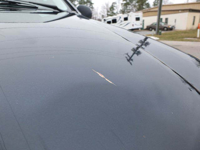 The only paint blemish of note in the dark blue paint is this 3" scratch on the hood.