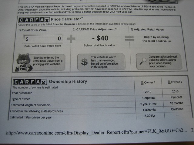 ONE OWNER LEASE TO RETAIL PURCHASE. THIS CAR IS IN EXCELLENT CONDITION AS IT SHOULD BE. VERY LOW MILES AND THE CAR CARRIES A PORSCHE CERTIFIED PRE-OWNED WARRANTY. THE ORIGINAL IN SERVICE DATE ON THIS CAR WAS NOVEMBER 29TH. 2009. SO, THE WARRANTY IS VALID THROUGH NOVEMBER 29TH. 2015.