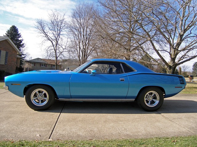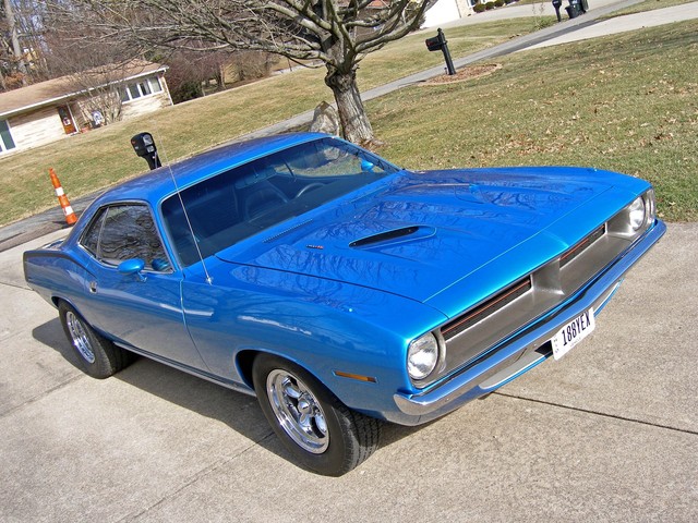 1970 Plymouth Cuda 440, 4-speed. Body off, Rotisserie restoration on this all original sheet metal car with 64000 original miles. Original 318, automatic car. Built Oct. 1969.