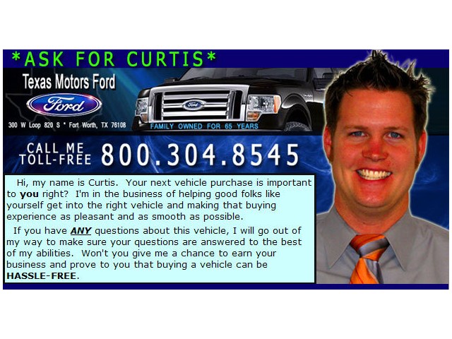 WELCOME TO TEXAS MOTORS FORD'S EBAY AUCTIONS! WE ARE FORT WORTH TEXAS'S OLDEST FORD DEALER FAMILY OWNED AND OPERATED FOR MORE THAN 65 YEARS! WE ARE PROUD TO OFFER OUR HAND PICKED VEHILCES ON E-BAY! WE OFFER FREE AIRPORT PICK UP AND MORE! WE MAKE IT SIMPLE TO BUY! WE ONLY SELL CLEAR TITLE, CLEAN CAR FAX VEHICLES ON OUR E-BAY SITE! CALL CURTIS WITH ANY QUESTION ON MY CELL PHONE TOLL FREE ANYTIME AT 1-800-304-8545. THANK YOU FOR LOOKING AT OUR VEHICLE WE HOPE TO MAKE YOU PART OF THE FAMILY! ALL AUCTIONS ARE PRIVATE OFFERS FOR YOU OUR EBAY COMMUNITY. PLEASE CONTACT CURTIS WITH ANY QUESTIONS!