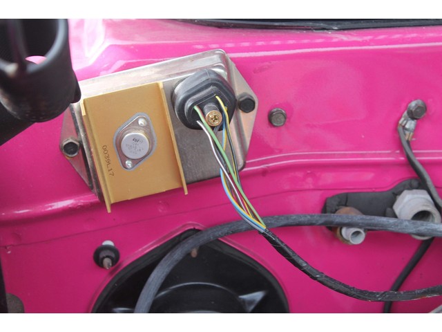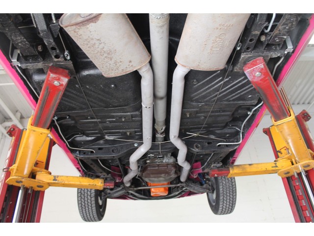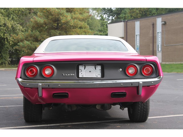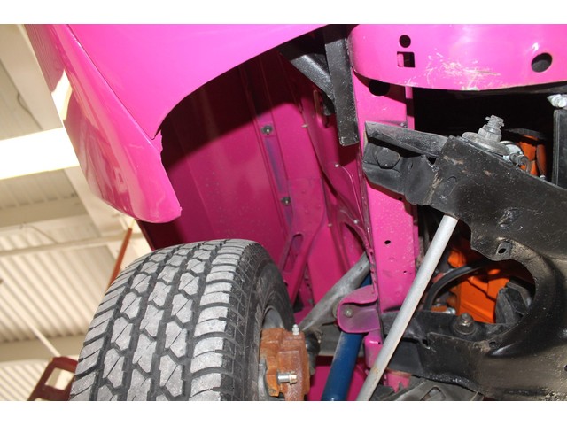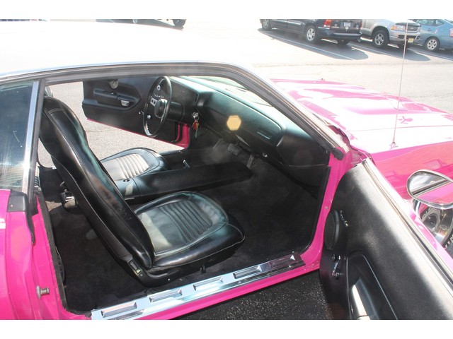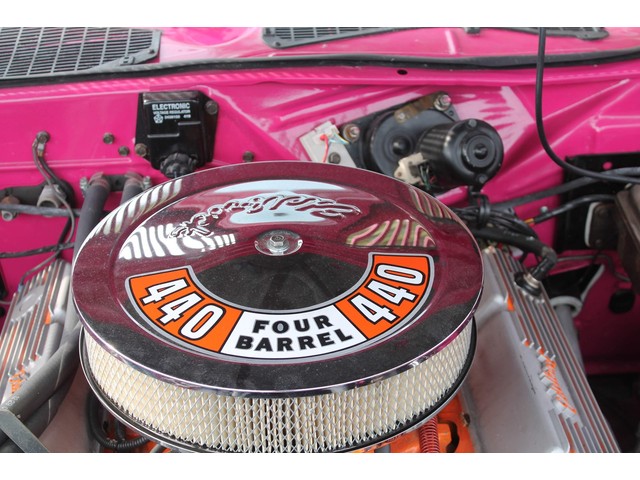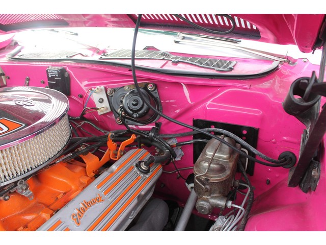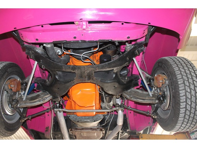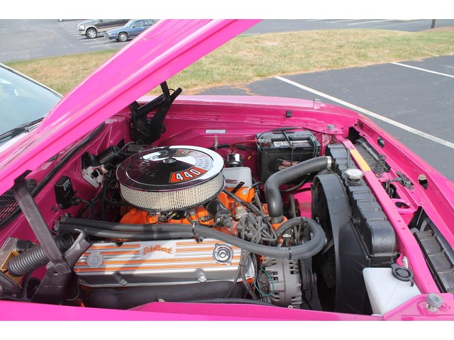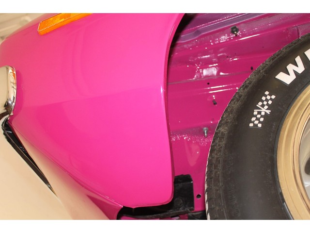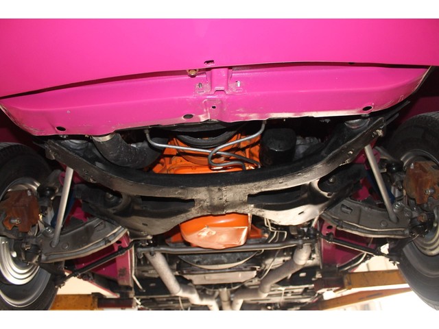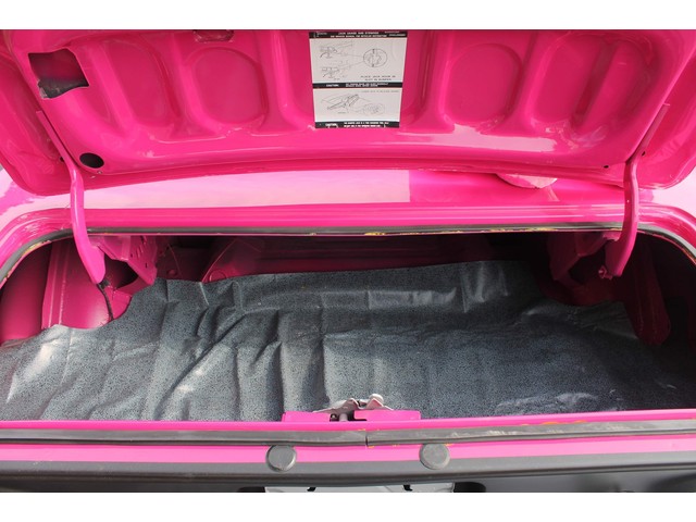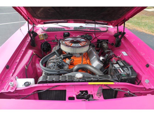 The car was soda blasted to bare metal and repainted back to Panther pink.  The entire trunk as well as the front frame rails and inner wheel wells were painted to make the car stand out; the engine and transmission were removed as well as the entire interior.  The engine was torn down and rebuilt to factory specs and then painted.  New Edlebrock valve covers along with an air cleaner were added, the A/C compressor was removed and not replaced.