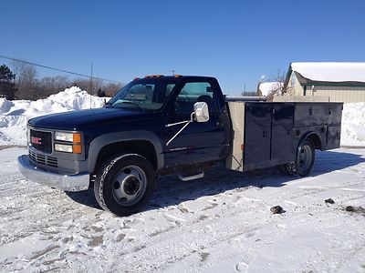 2000 Diesel GMC Sierra 3500 with a Utility box and a Theiman Lift Gage. This Truck still has a lot of life in it. The Truck has plenty of storage for tools and parts to get the job done. The Engine runs great and no mechanical issues. The Truck has some rust and the rear passenger tool door is in need of repair. If you need a good truck for the job call today 989-482-4430.