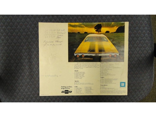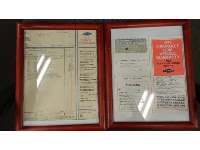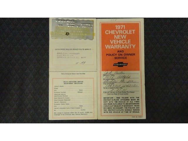 It was delivered new by Fencl-Tufo Chevrolet in Glendale Heights, IL on February 21, 1971. The window sticker price was $3,781.70 and the dealer delivered price was $3,679.20.  All of this is documented on the original 1971 Chevelle sales brochure in handwriting on the back of the brochure.